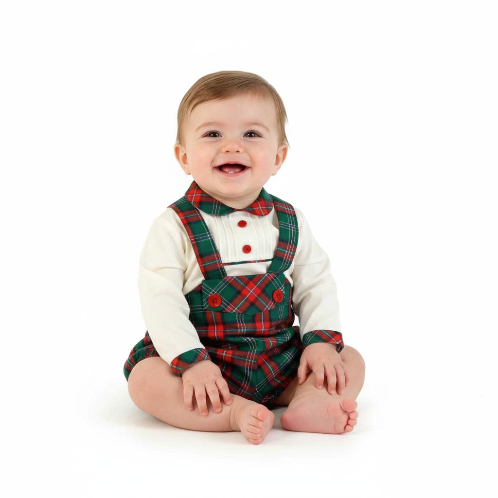 Precioso conjunto de 2 piezas para bebe niño de la marca Miranda. Esta compuesto de pantalón corto con tirantes estampado de cuadros con la trama verde y rojo que lleva goma en la perneras y 2 botones decorativos en el delantero. A juego con camisa blanca de manga larga con los puños y el cuello bebe del mismo estampado del pantalón con botonadura decorativa de 2 botones en el delantero y cierre de botones en la espalda.
