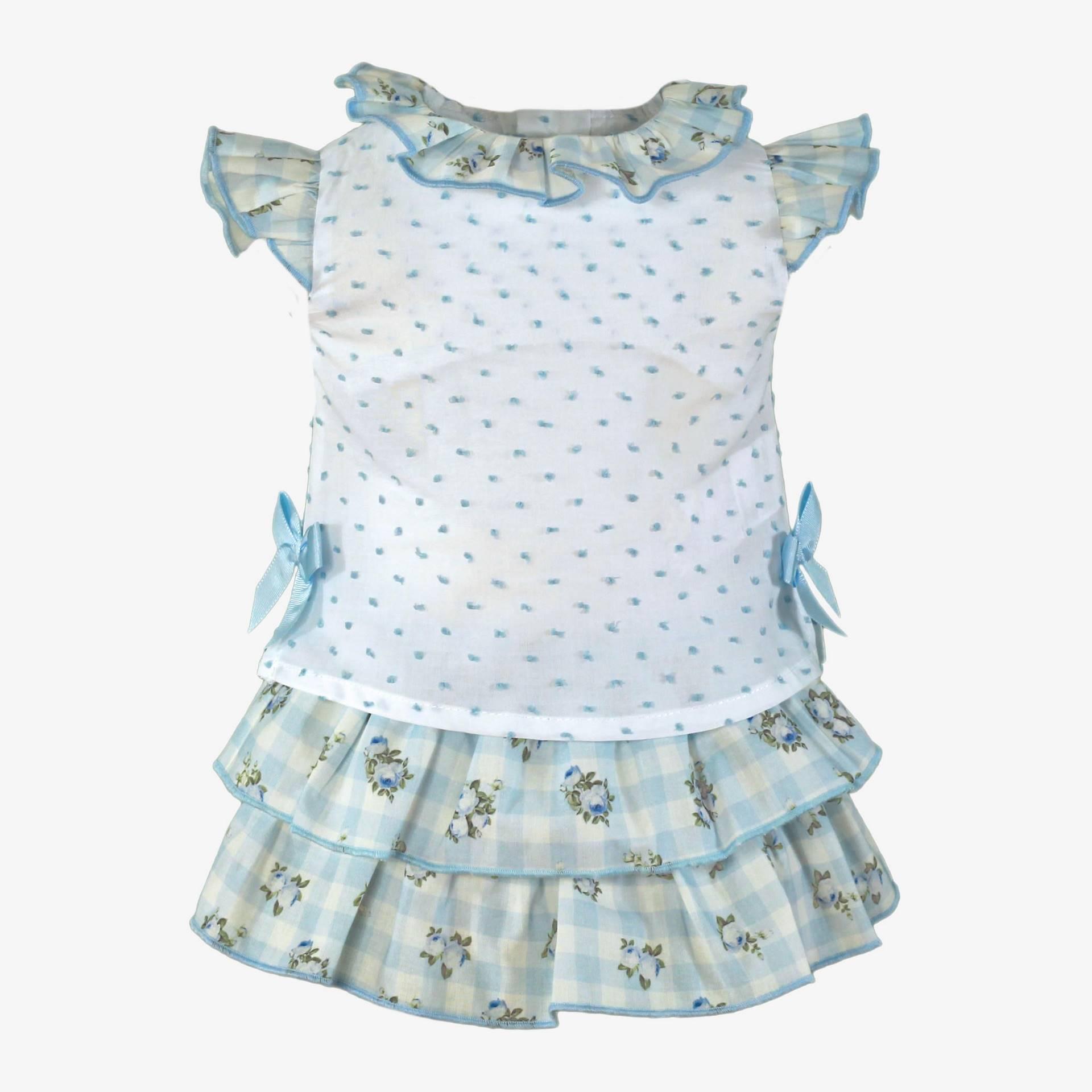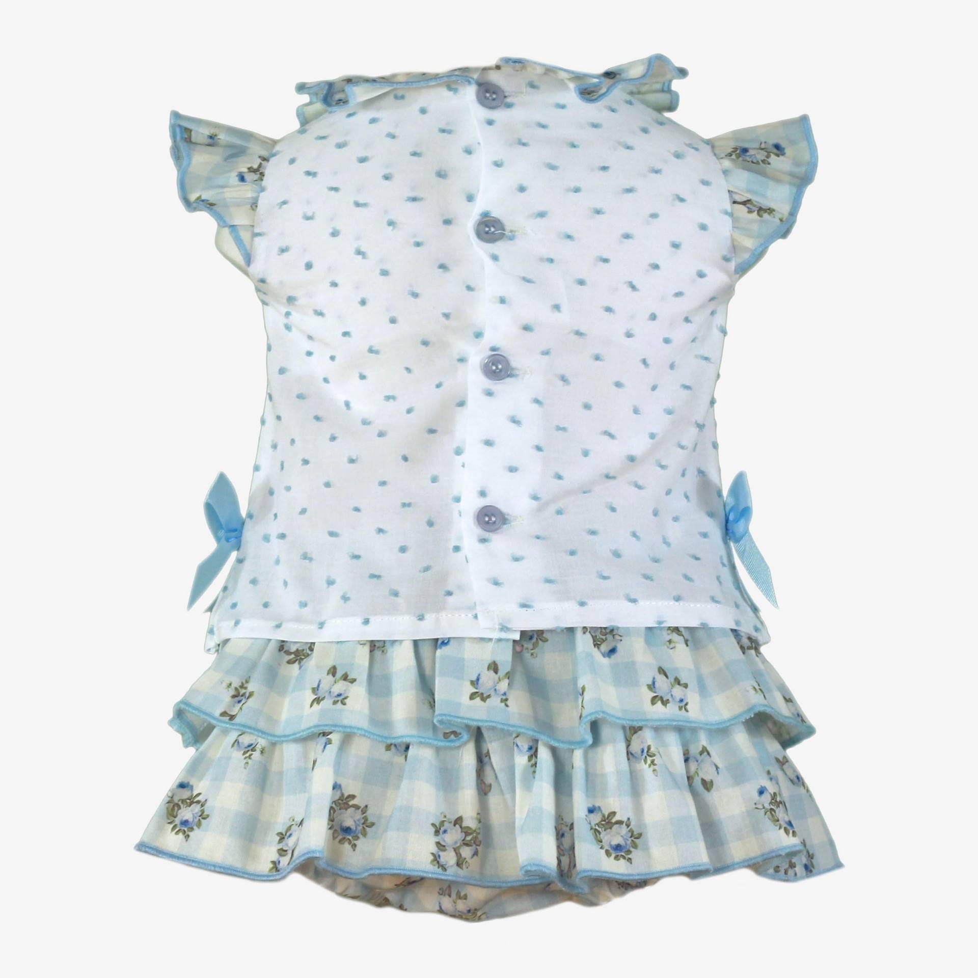 Elegante conjunto de 2 piezas para bebe niña de la marca Miranda. Esta compuesto de blusa blanca de plumeti con el grano azul que luce lazada de raso a los lados y volantes en el cuello y los hombros de tela estampada de cuadros y flores en tono azul a juego con la braguita con sobrefalda de 2 volantes. La blusa cierra en la espalda con botonadura vista.