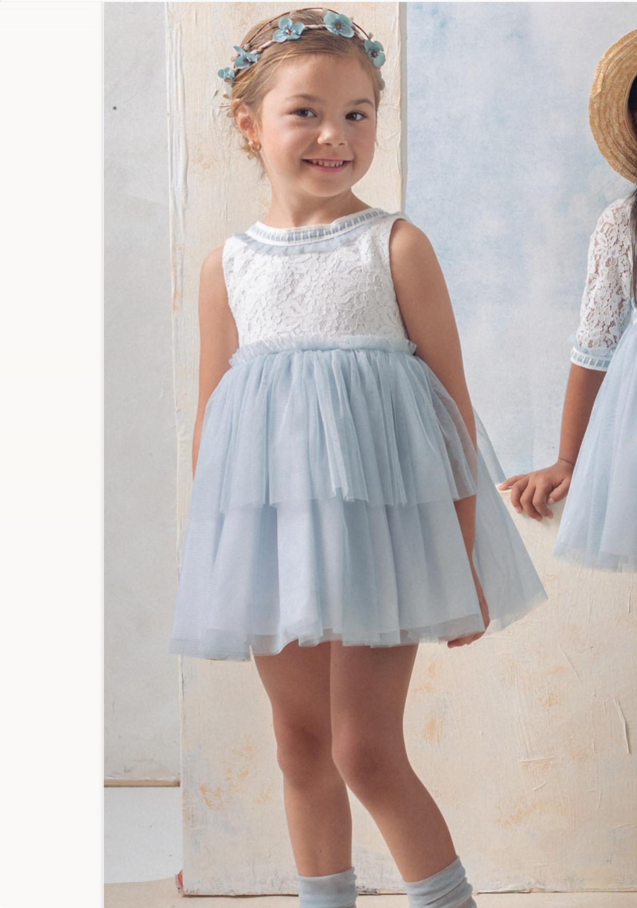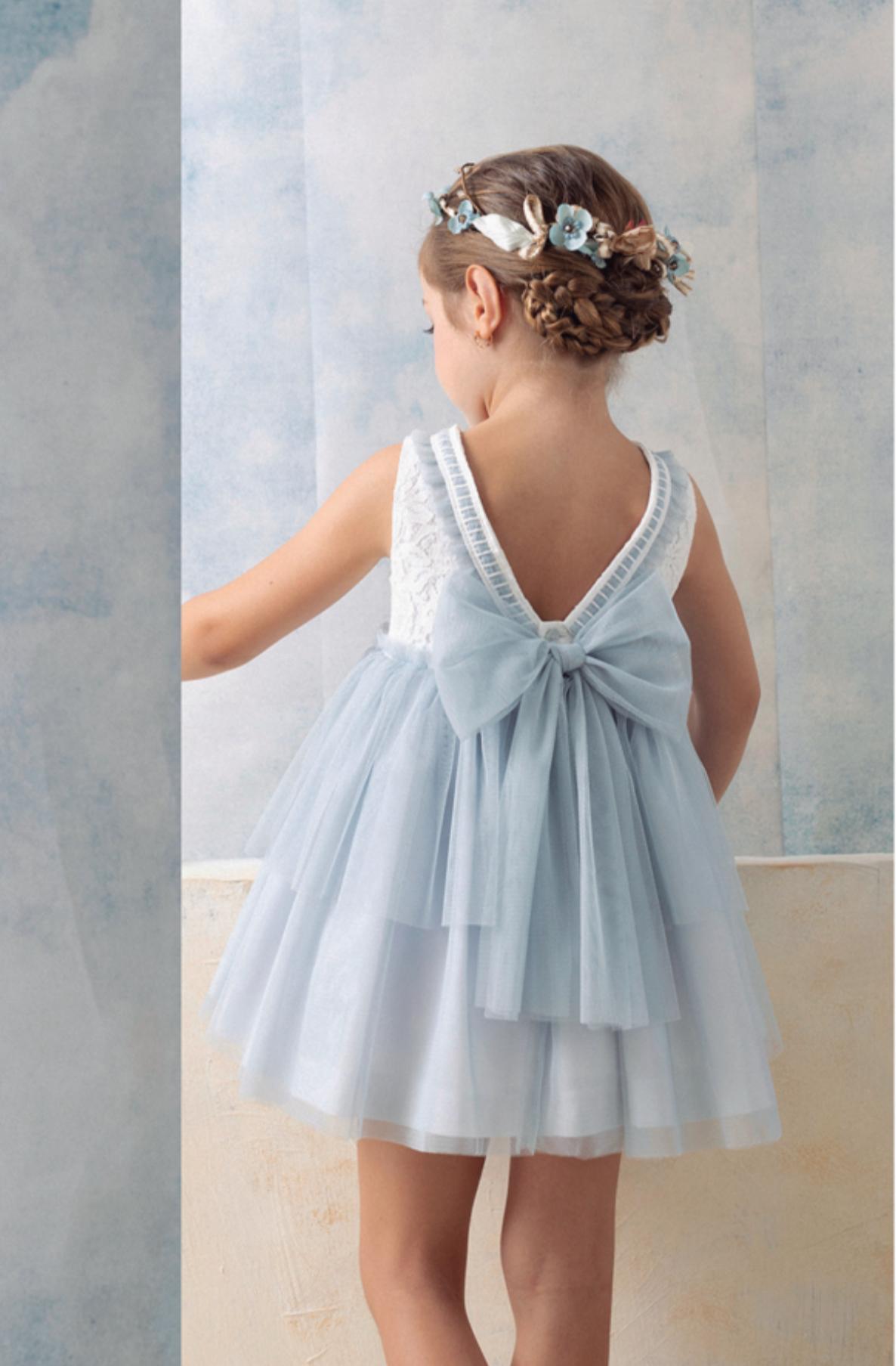 Basmarti Vestido Infantil ceremonia Edha Guipour Blanco volantes Tul Azul 26010