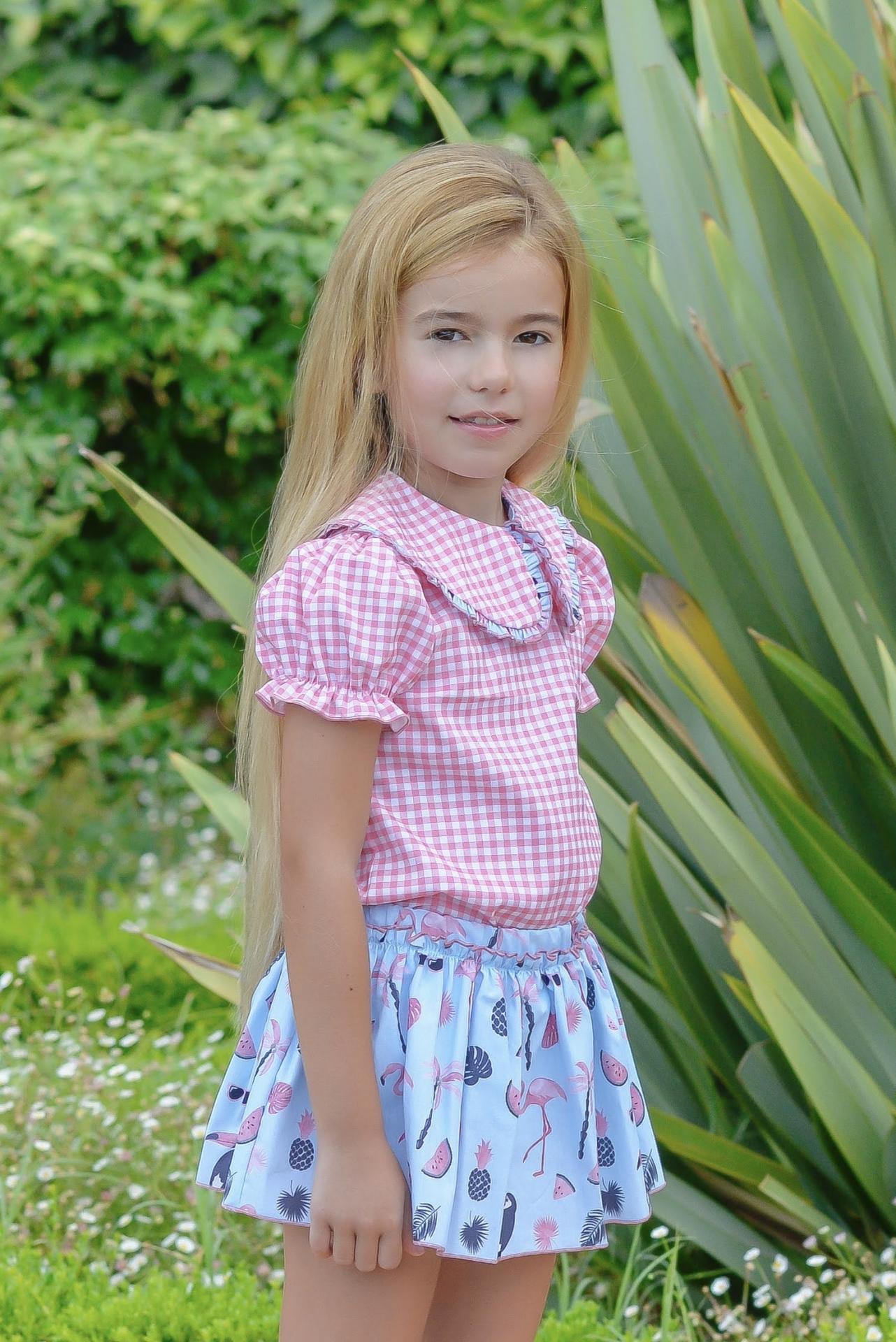 Daniesty Conjunto "LAGUNA" Infantil Falda Estampada flamencos Blusa Cuadro Vichy 014