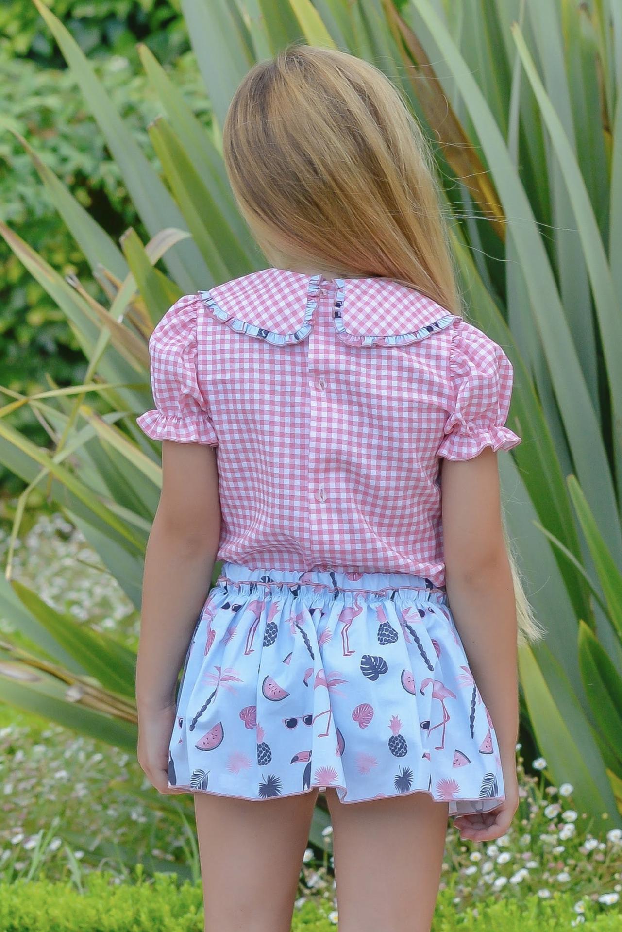 Fabuloso conjunto de 2 piezas para niña de la marca Daniesty. Esta formado por falda de color azul estampada con motivos tropicales como flamencos y palmeras en tono rosa y blusa de manga corta abullonada de cuadro vichy rosa y blanco que además luce gran cuello de solapa ribeteado con volante de la tela de la falda y cierra en la espalda.