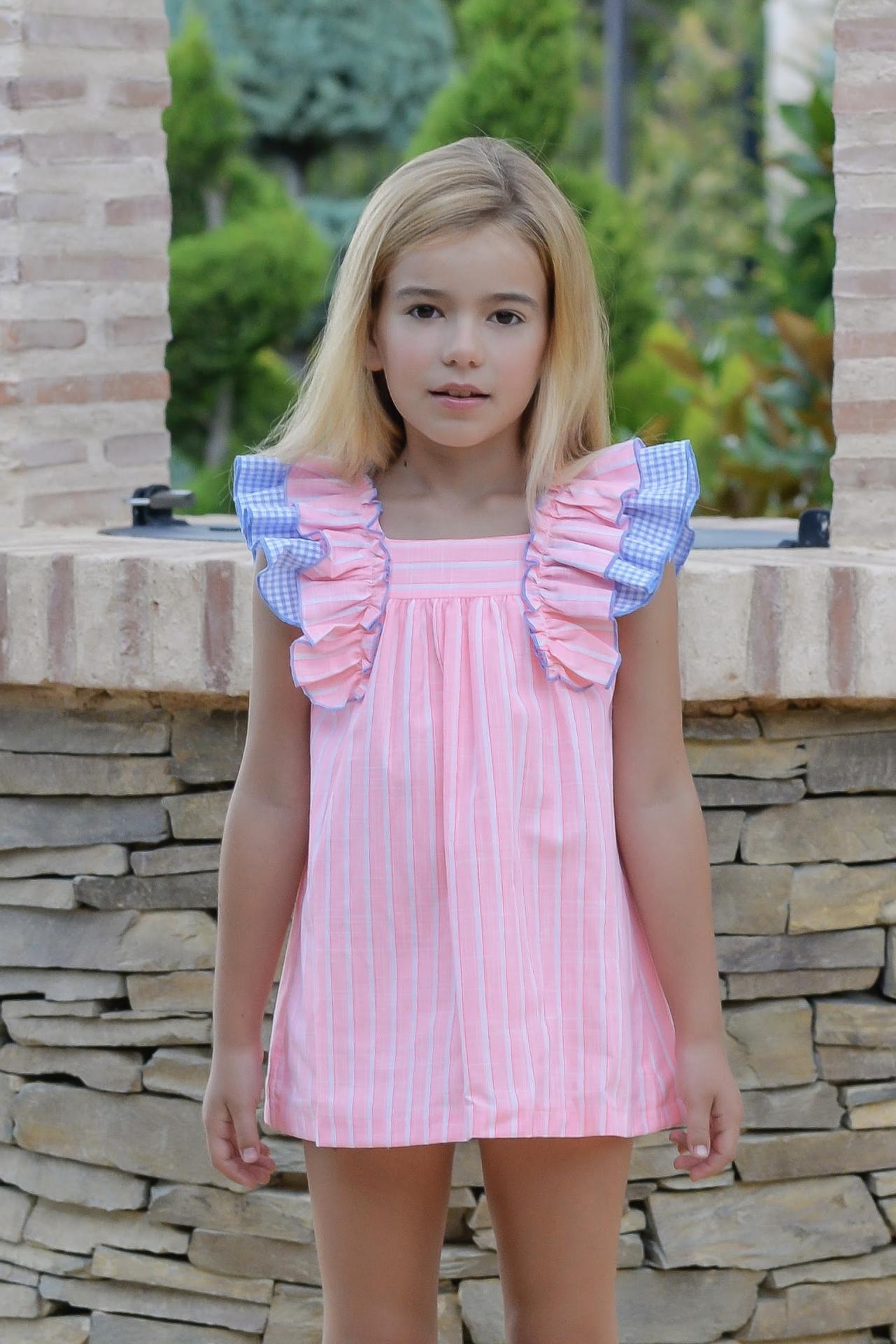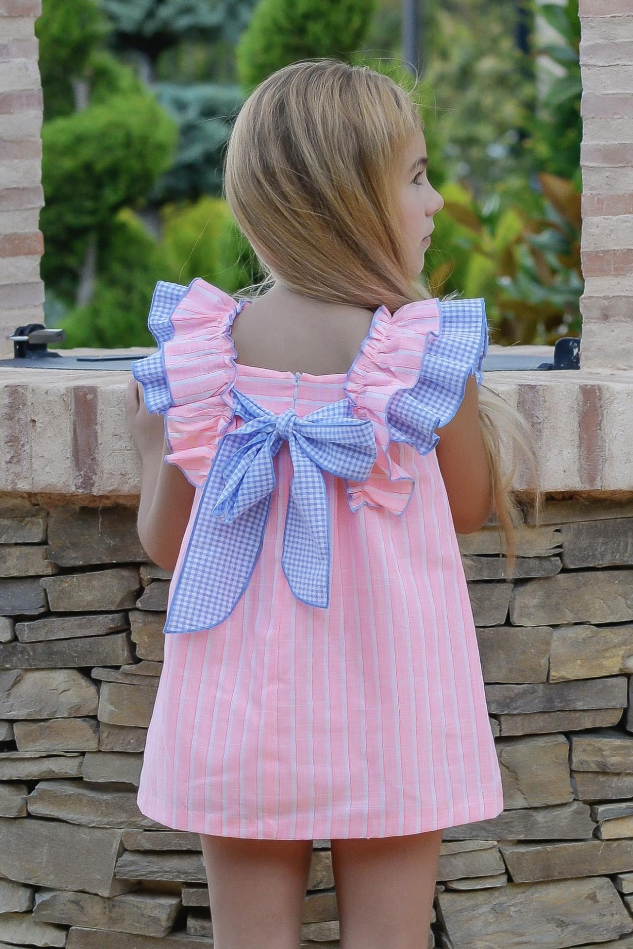 Divino vestido sin mangas para niña de la marca Daniesty. Esta confeccionado en tejido color rosa estampado de rayas verticales blancas. Lleva corte evase con drapeado en el corte. Luce 2 volantes en los hombros, uno de la misma tela de rayas ribeteado con hilo azul y otro de cuadro vichy azul y blanco que van desde la parte delantera hasta la trasera, donde luce escote cuadrado y gran lazada de cuadro vichy azul y blanco. Cierra en la espalda con cremallera invisible.