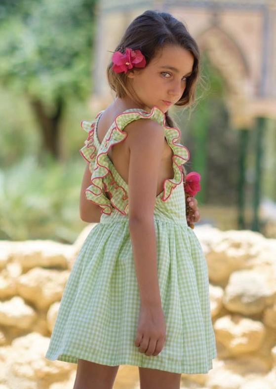Nekenia Vestido Infantil Sapito Cuadros Pistacho Tirantes Cruzados Espalda Vivos Fucsia 24VV08