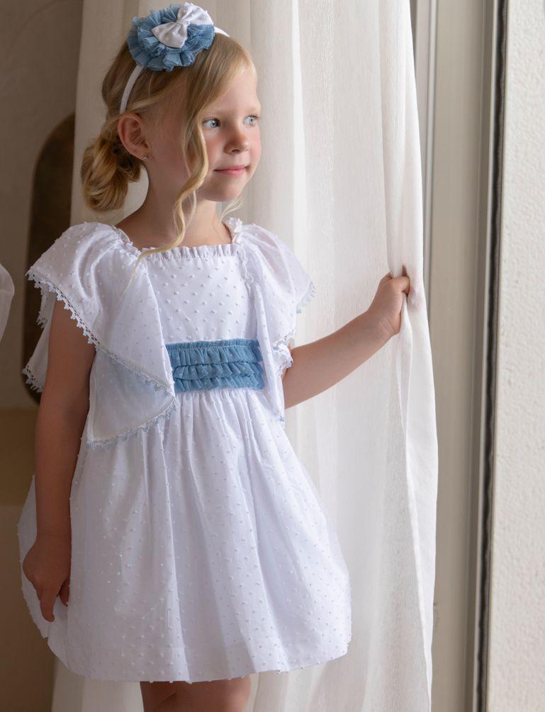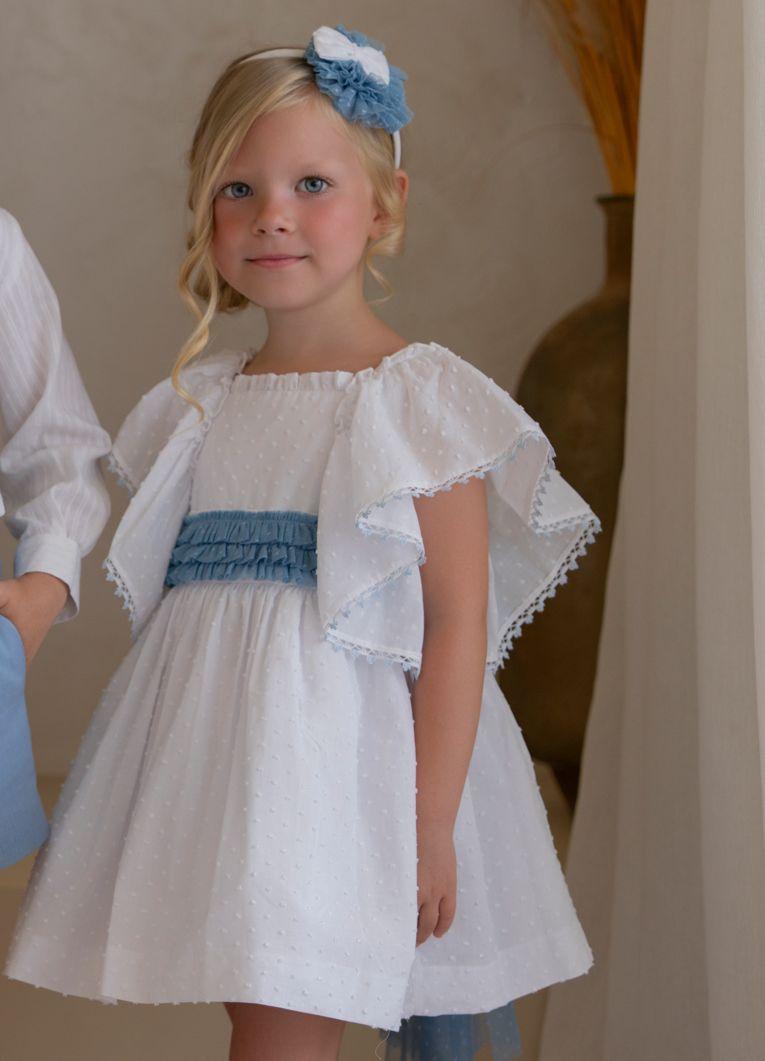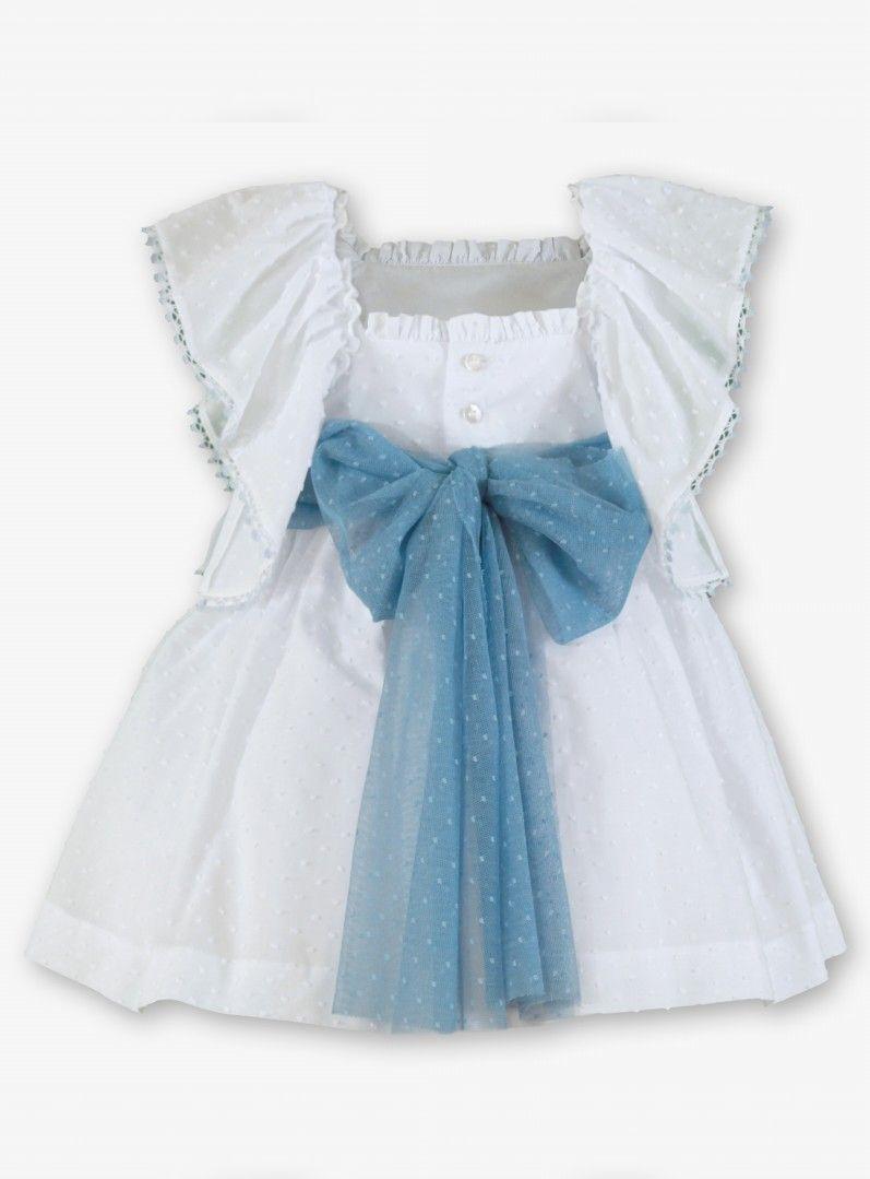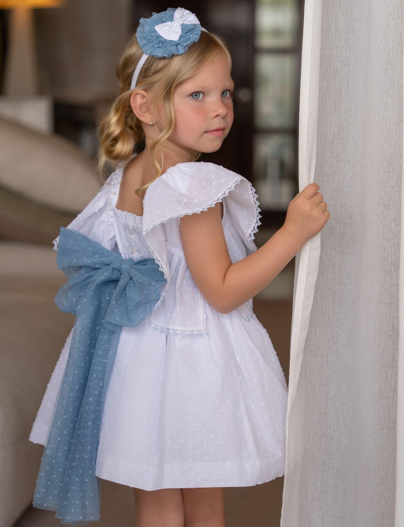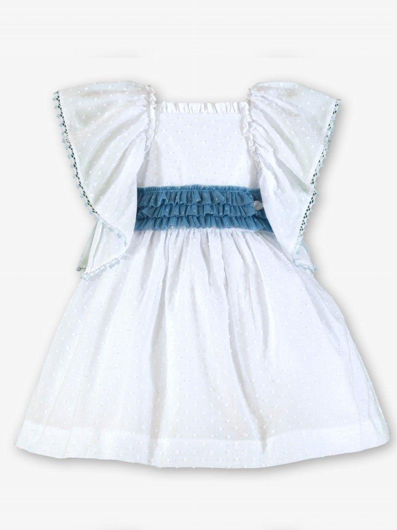Miranda Vestido Infantil Ceremonia Plumeti Blanco lazada Azul "Geranio" 0228/V