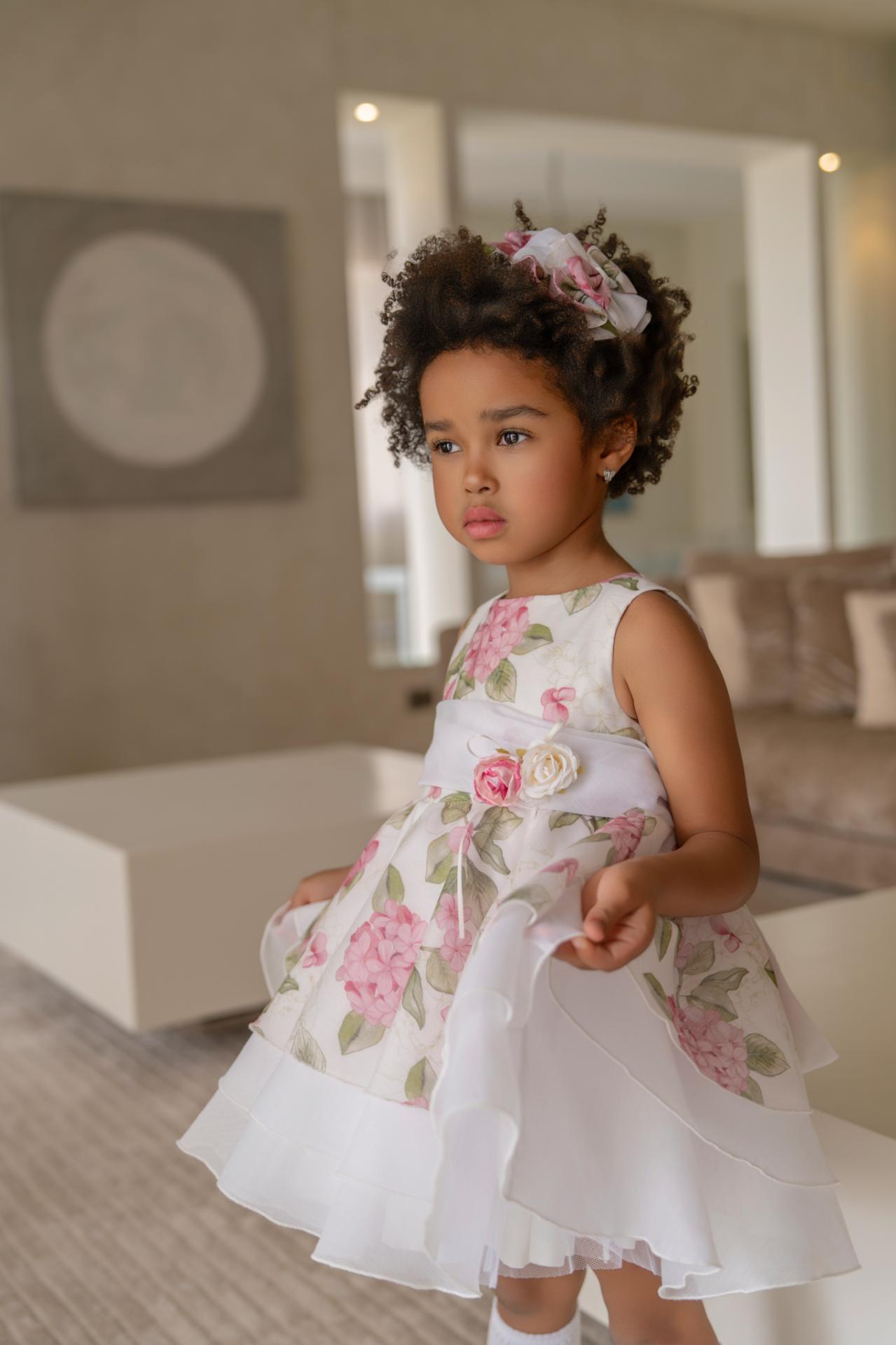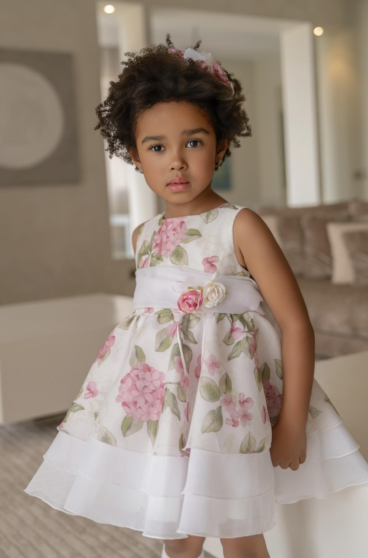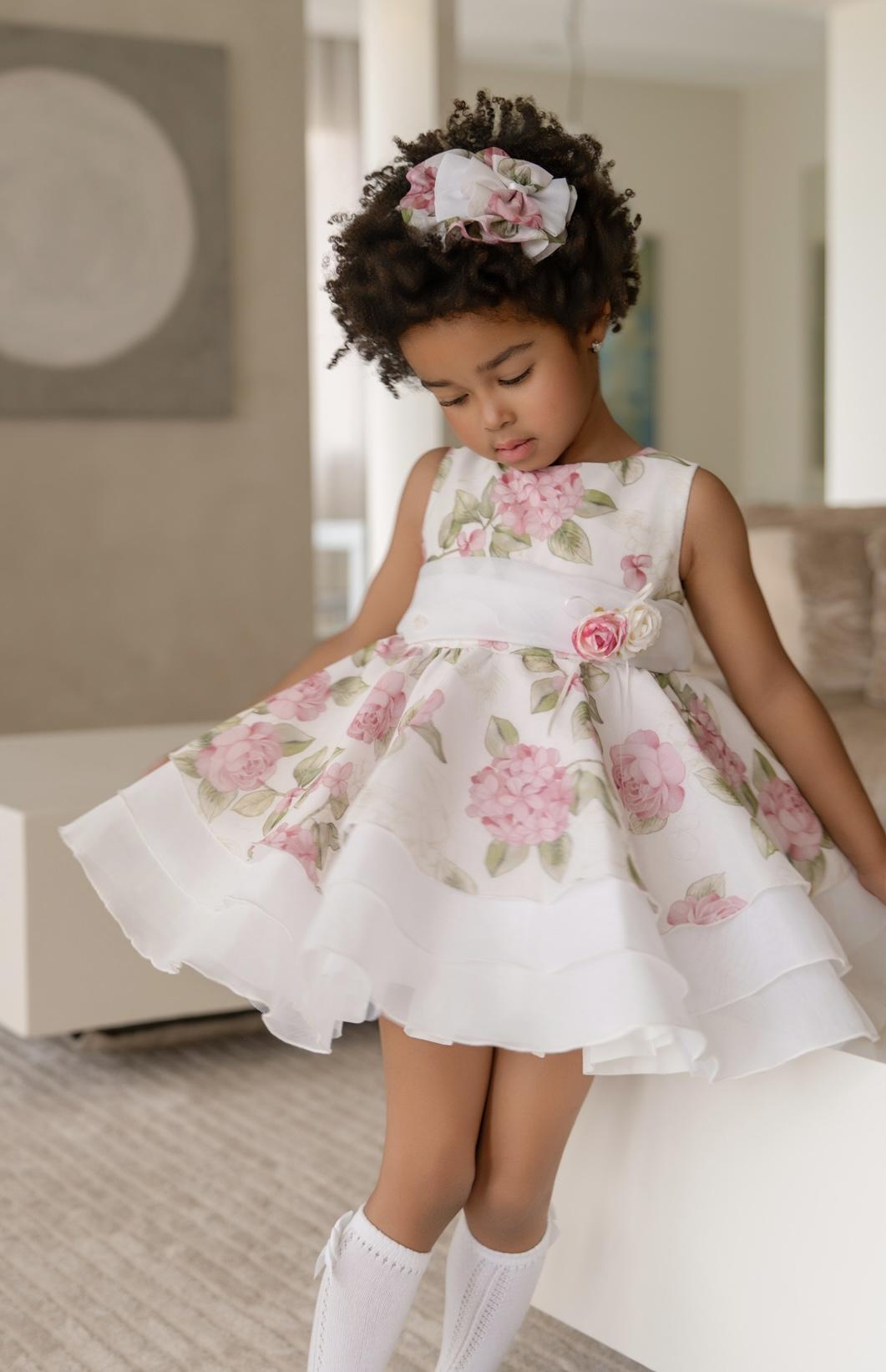 Elegantísimo vestido de ceremonia para niña de la exclusiva marca Miranda, confeccionado en una delicada gasa blanca de caída suave, destaca por su precioso estampado de grandes flores en tonos rosa y verde, que aporta un aire fresco, romántico y muy distinguido.