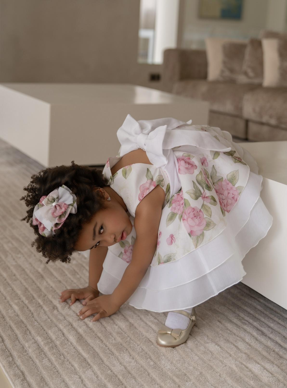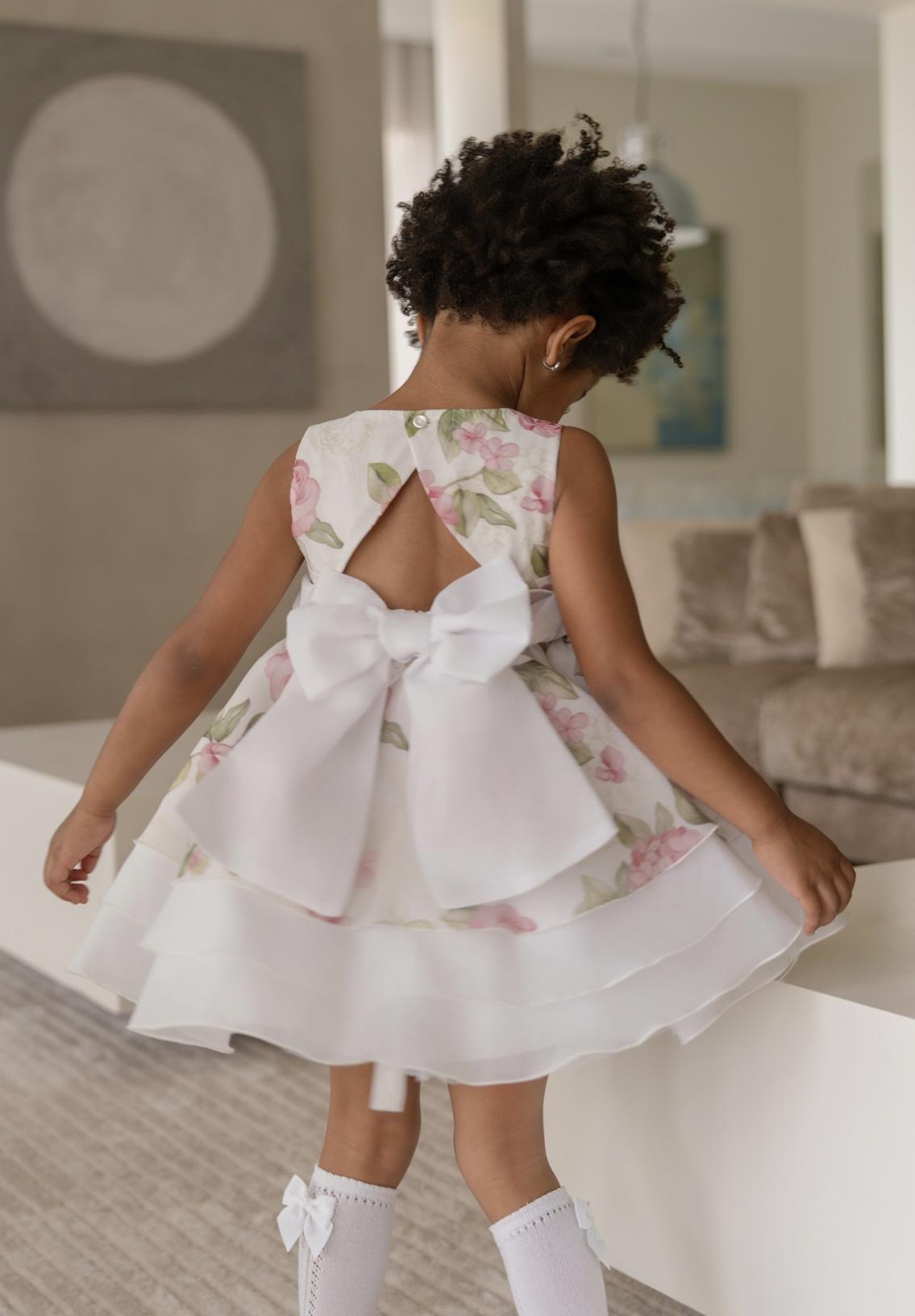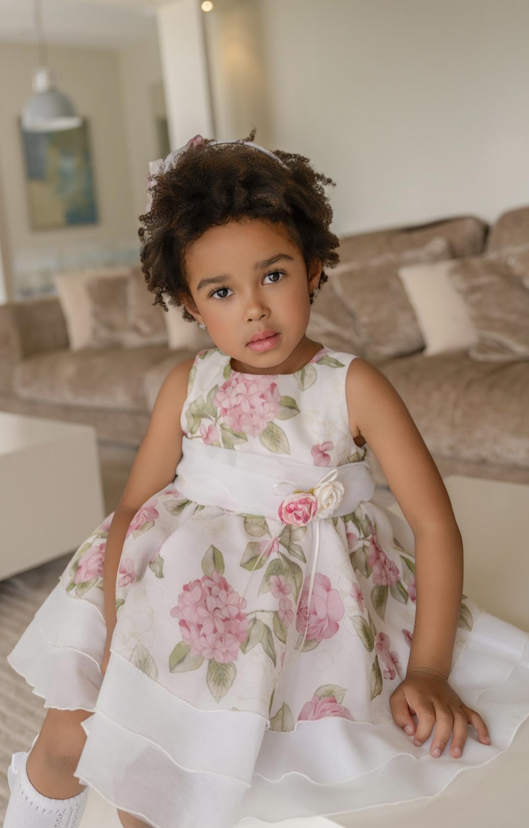 Elegantísimo vestido de ceremonia para niña de la exclusiva marca Miranda, confeccionado en una delicada gasa blanca de caída suave, destaca por su precioso estampado de grandes flores en tonos rosa y verde, que aporta un aire fresco, romántico y muy distinguido.