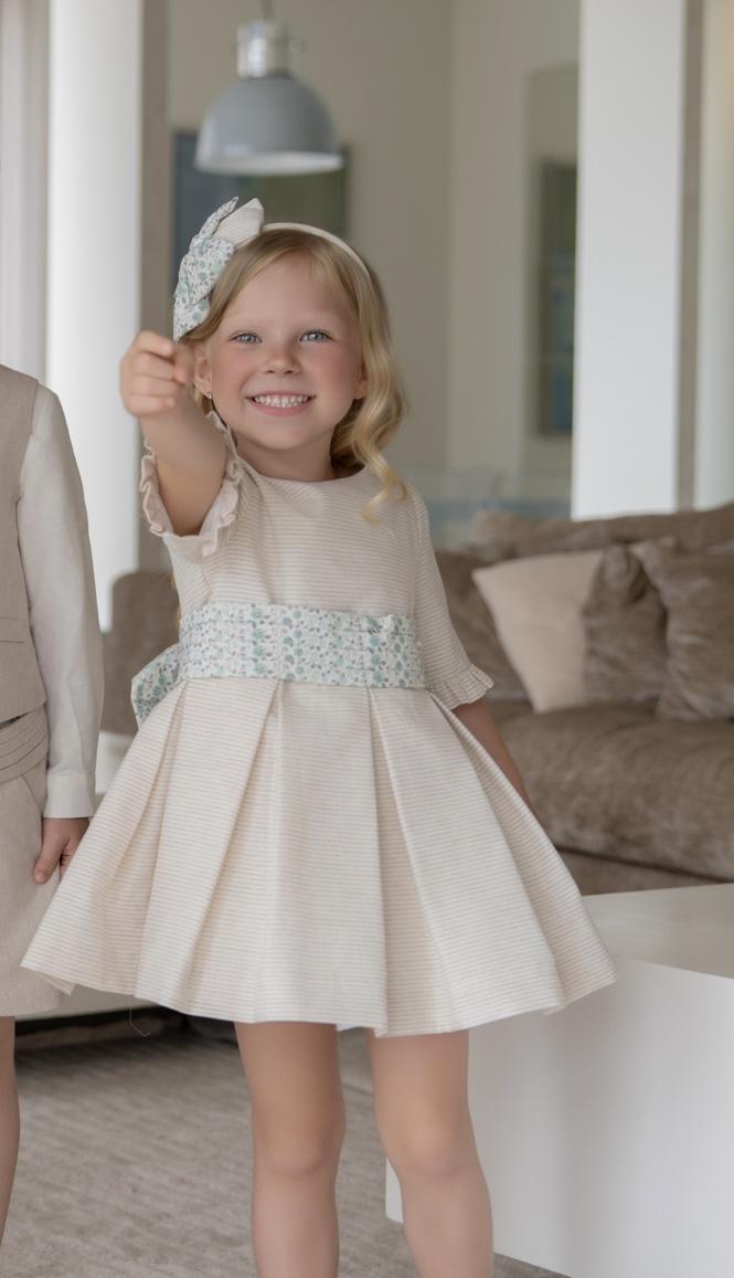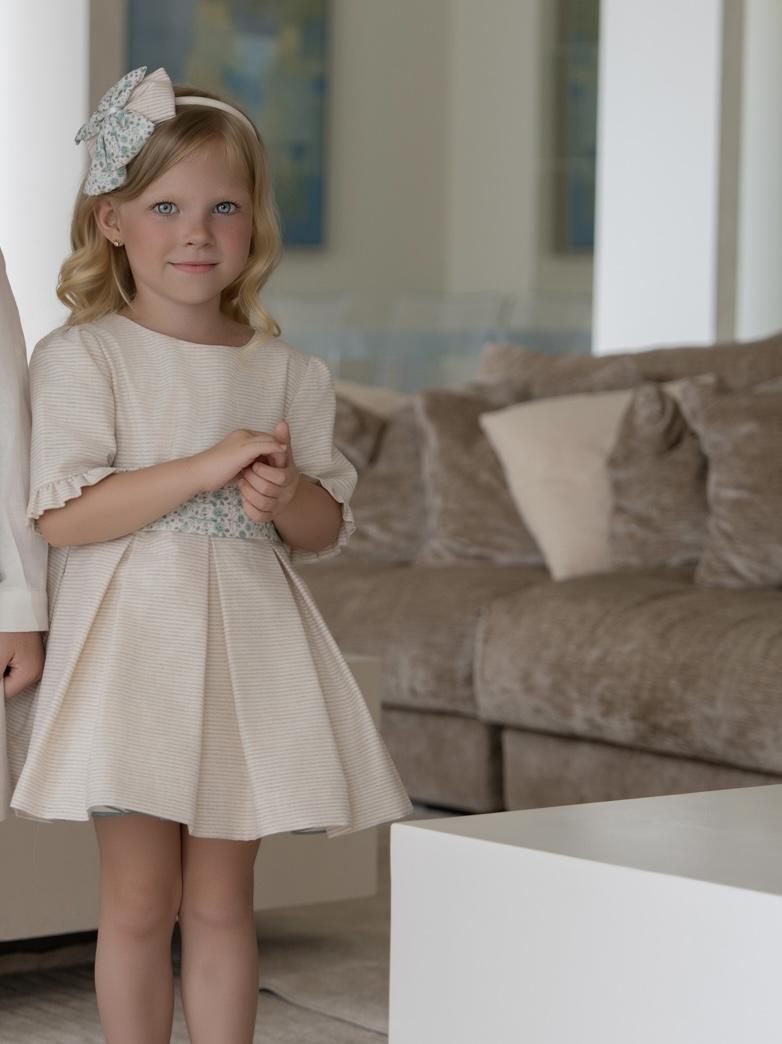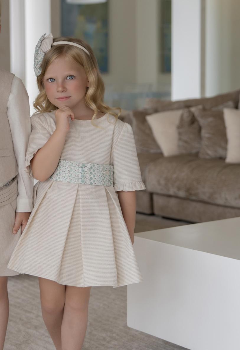 Colosal vestido de ceremonia para niña de la marca Miranda. Esta confeccionado en tejido de rayas horizontales en tono beige, con corte en la cintura y la falda de diseño de tablas. Lleva manga corta hasta el codo rematada con pequeño volante de la misma tela. Se adorna con fajin de tela estampada de flores en tono verde con diseño plisado que termina en la espalda con gran lazada. Cierra en la espalda con cremallera invisible.
