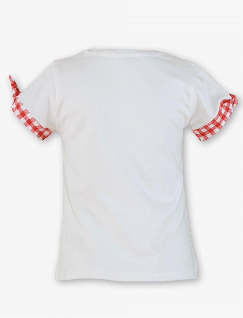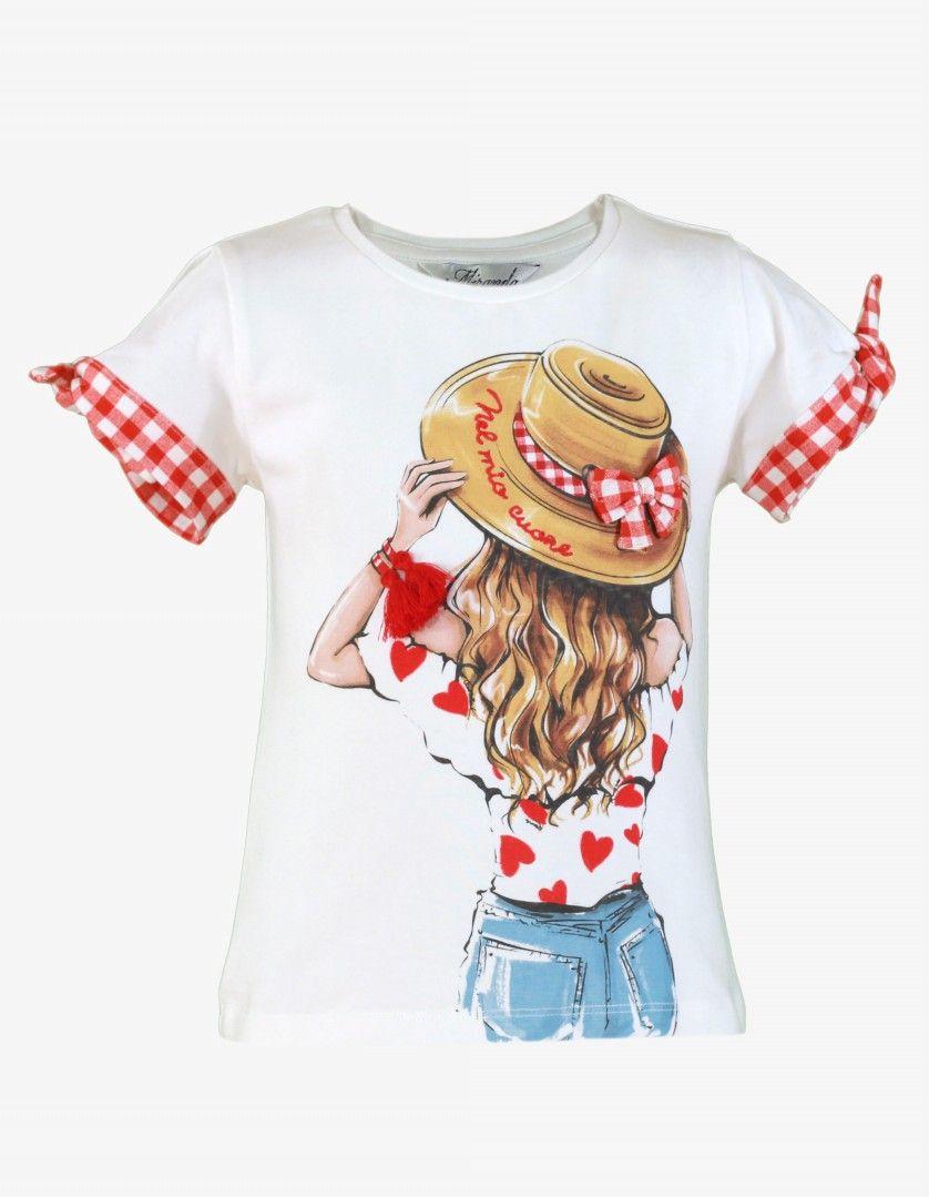 Magnifica camiseta de manga corta para niña de la marca Miranda. Confeccionada en color blanco con serigrafia en el delantero de chica de pelo largo con sombrero y camiseta de corazones rojos. Luce pieza anudada de cuadro vichy rojo y blanco en las mangas.
