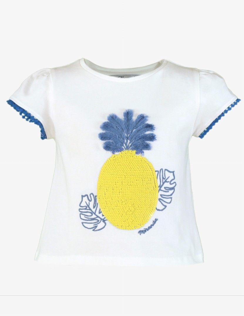 Coqueto conjunto de 2 piezas para niña de la marca Miranda, ideal para un look veraniego lleno de color y frescura. Está formado por una camiseta blanca de manga corta que luce en el delantero una divertida serigrafía de piña en tonos amarillo y azul. Las mangas se adornan con pequeñas borlas azules, aportando un toque alegre y desenfadado.
