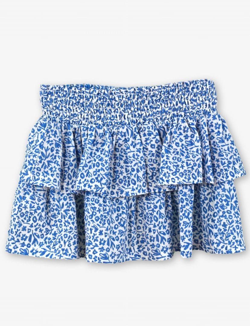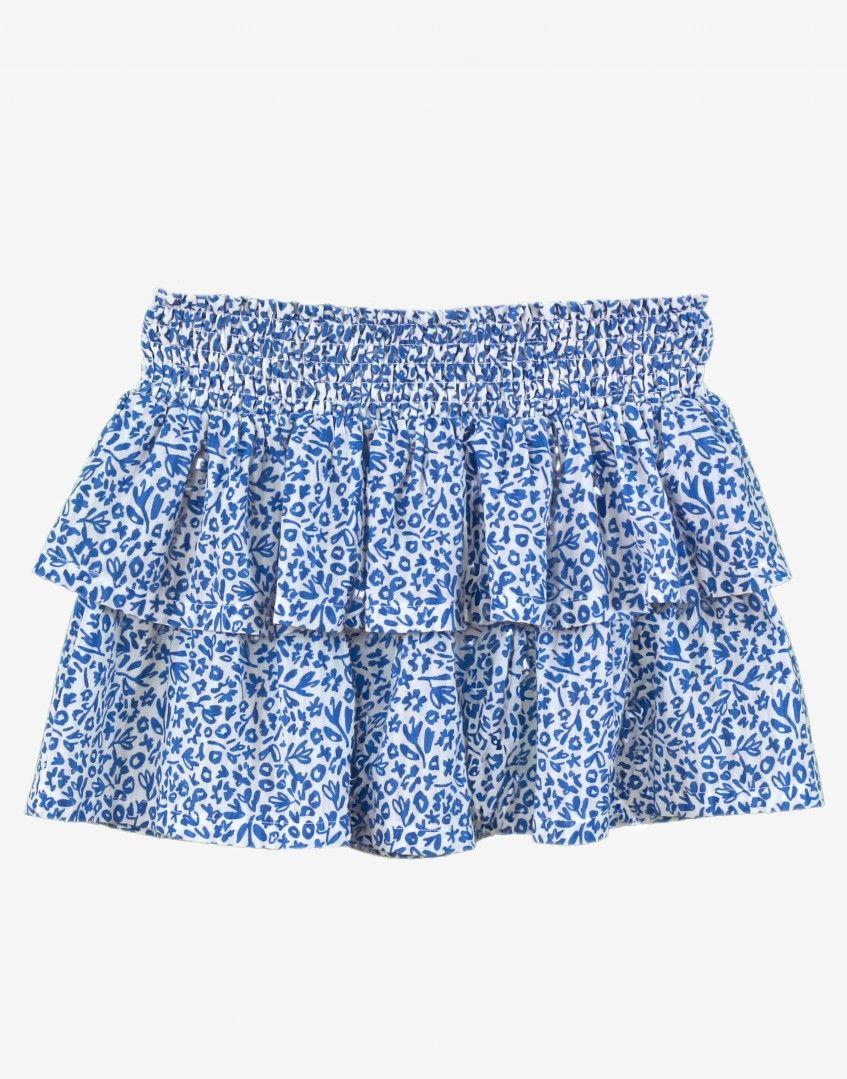 El conjunto se completa con una falda de dos volantes, confeccionada en tejido estampado con formas azules. Se ajusta cómodamente gracias al elástico en la cintura, ofreciendo libertad de movimiento y un ajuste perfecto. Un conjunto cómodo, ligero y muy estiloso, perfecto para el día a día o para ocasiones especiales durante los meses más cálidos.
