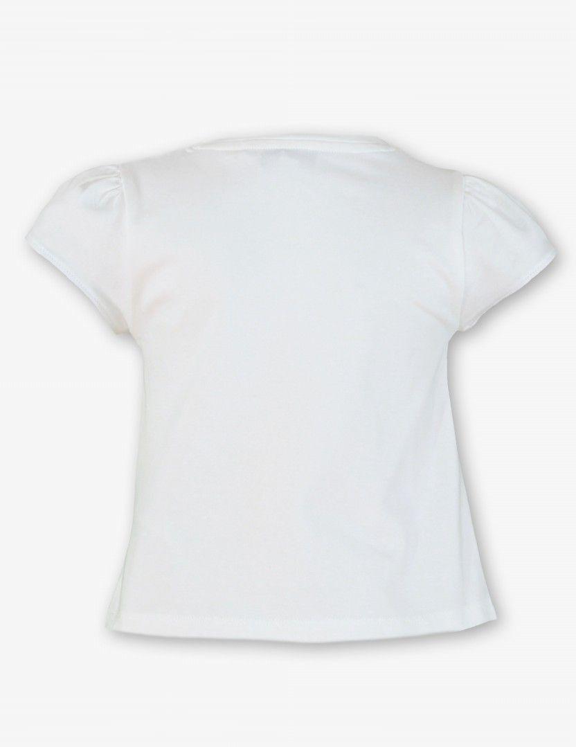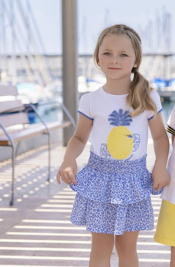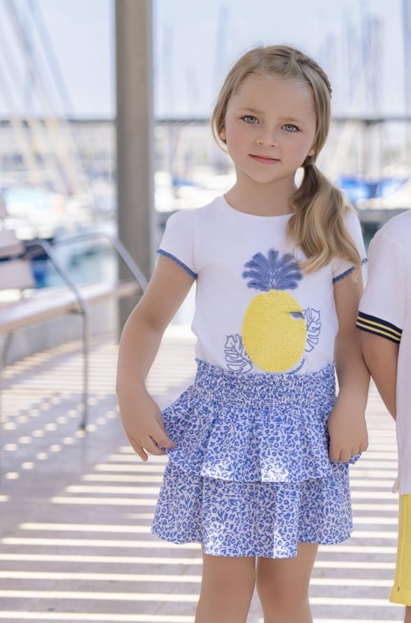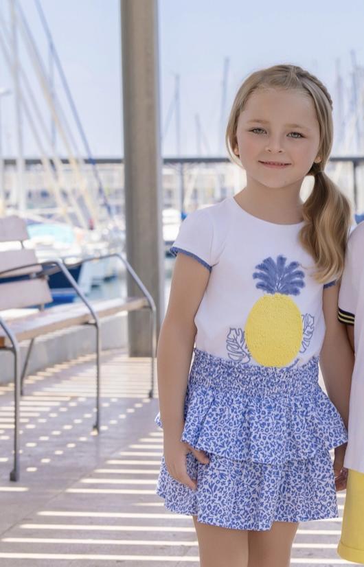 Coqueto conjunto de 2 piezas para niña de la marca Miranda. Formado por camiseta de manga corta blanca con serigrafia de piña amarilla y azul en el delantero que luce pequeñas borlas azules en las mangas. A juego con falda de 2 volantes estampada con formas azules que se ajusta con elástico en la cintura.