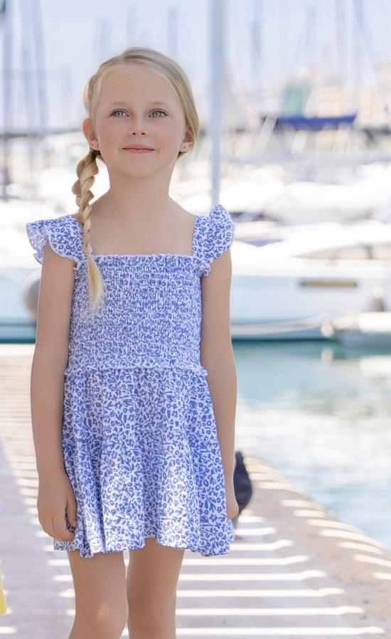 Fabuloso vestido de tirantes para niña de la marca Miranda, perfecto para un look fresco y elegante. De estilo sencillo y muy favorecedor, está confeccionado en tejido de color blanco con estampado en tono azul, una combinación clásica y veraniega.