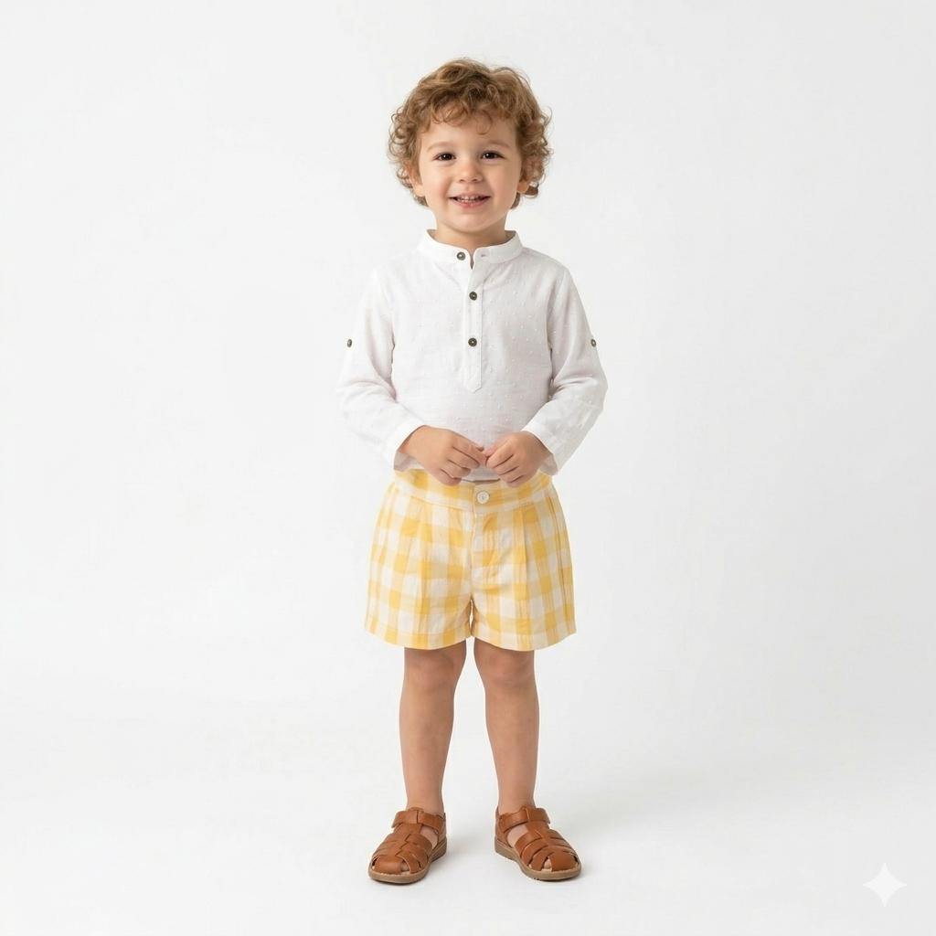 Nekenia Conjunto Bebé Camisa M/L Plumeti Blanco Pantalon Corto Cuadros 24VC19 Amarillo