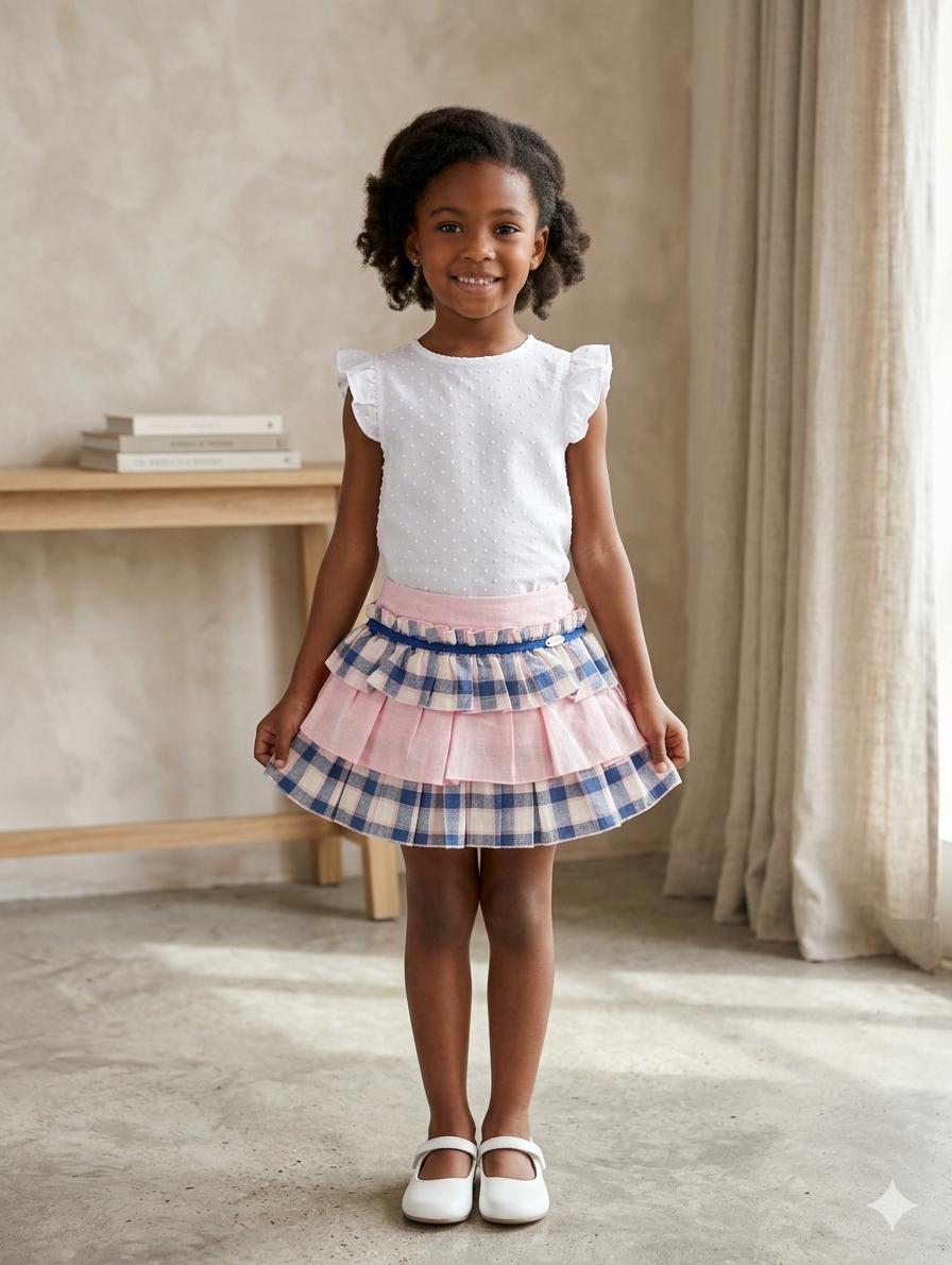 Daniesty Conjunto Falda Cuadros Azul y Rosa Blusa Plumeti Sin Mangas Blanca Familia Clara 014
