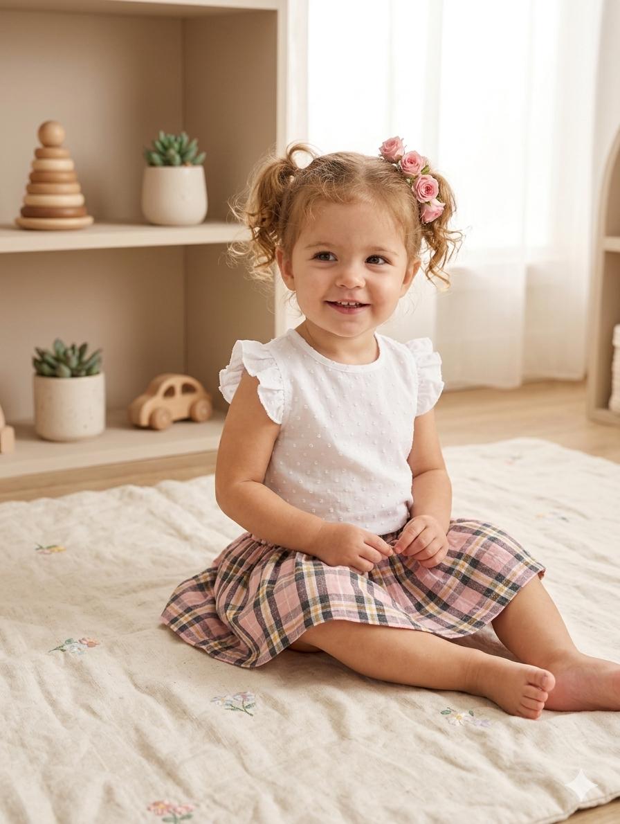 Daniesty Conjunto Falda Braga Cuadros Marino y Rosa Blusa Plumeti Sin Mangas Blanca Familia Clara 014