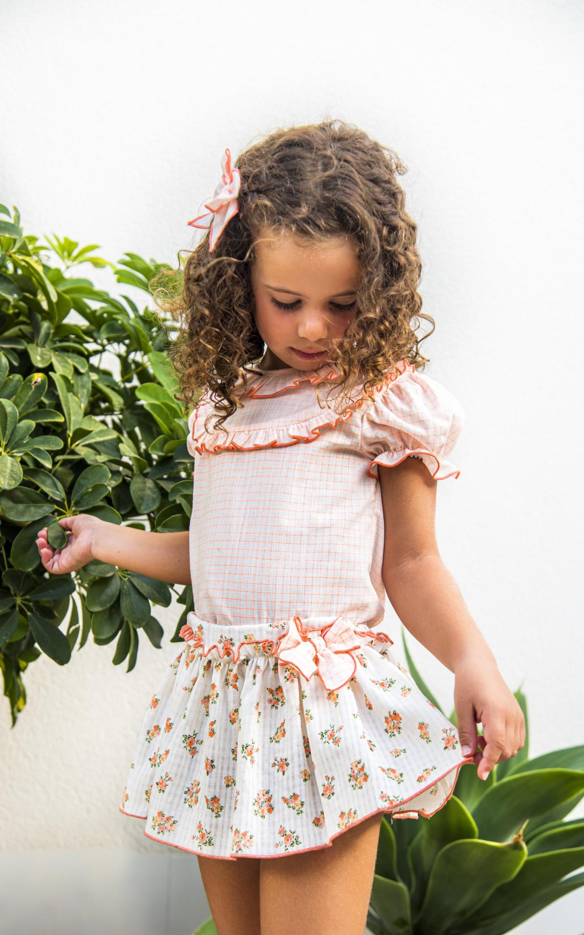 Daniesty Conjunto Falda Estampado Flores Blusa Cuadros Naranja Manga Farol Familia Florencia 014