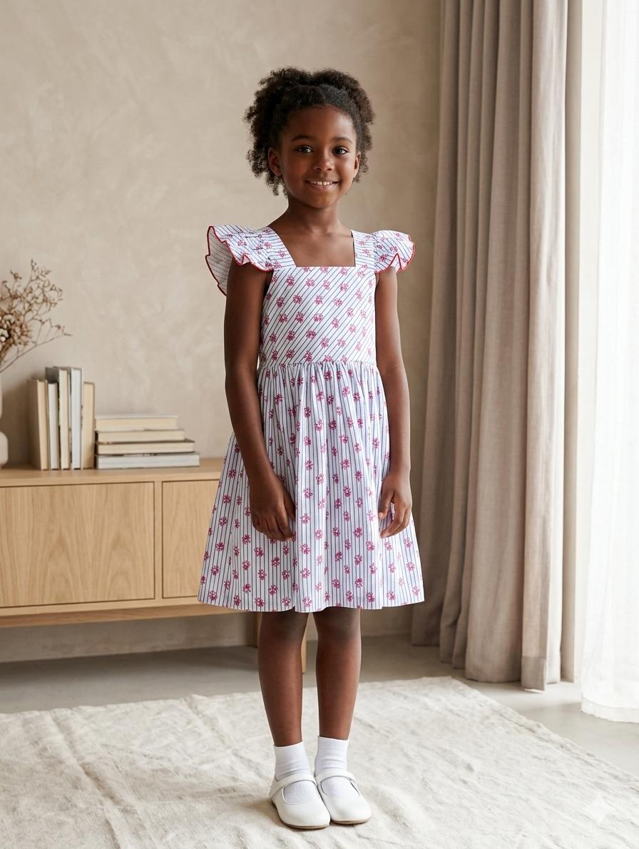 Daniesty Vestido Infantil Vuelo Rayas Estampado Flores Volante Hombros Familia Tokio 002