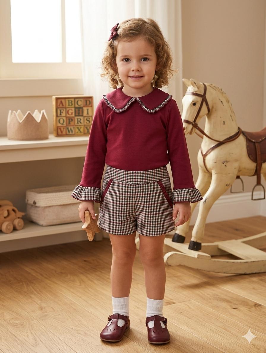 Daniesty Conjunto Blusa Punto Granate Detalles Cuadros Short Cuadros Familia Julieta 005