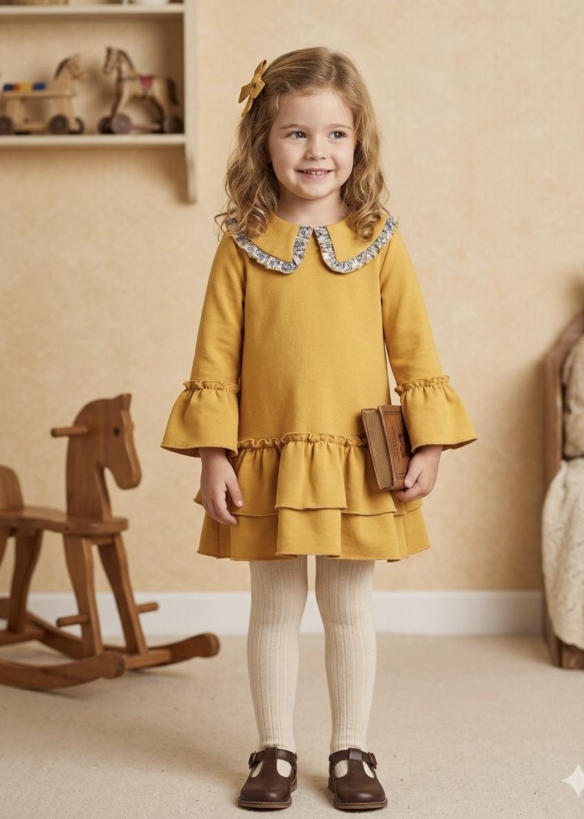 Daniesty Vestido Evase Mostaza Volantes Bajo Cuello detalles Estampado flores Azul Familia Anai 004