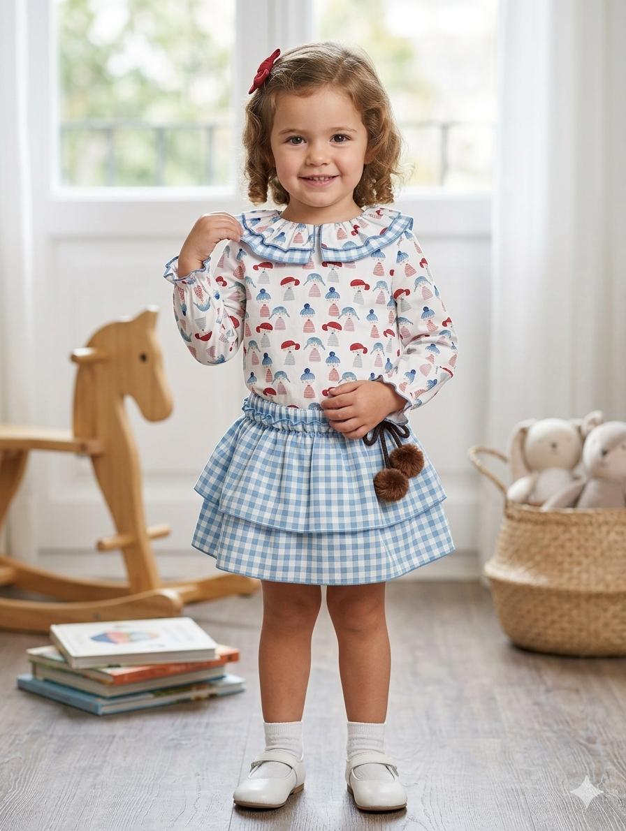 Daniesty Conjunto Infantil Camisa Estampado Muñecos Volante Cuello Falda Braga Cuadros Familia Pepona 014