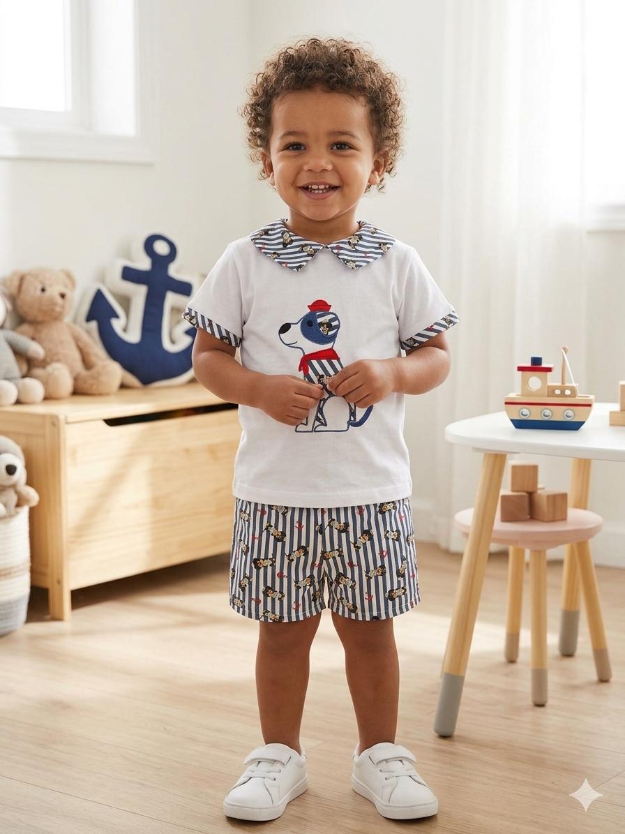 Este conjunto de dos piezas es un abrazo de amor en forma de ropa. La camiseta blanca, con su dulce dibujo de un perrito en el centro, es como un amigo fiel que siempre está ahí para tu pequeño. El cuello estilo camisa y las mangas cortas le dan un toque elegante y a la vez juguetón.
