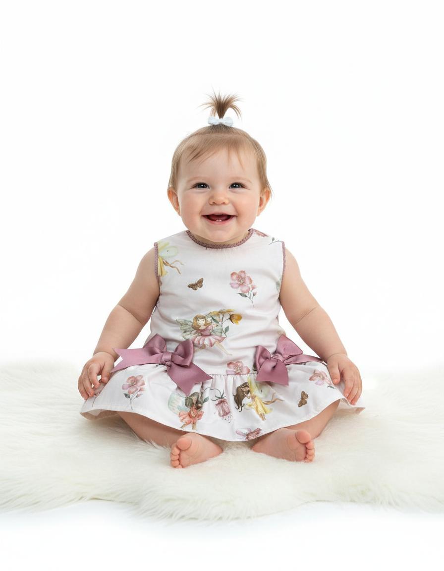 Daniesty vestido bebé sin mangas talle bajo Familia ZARINA, luce dos lazos rosa empolvado a juego