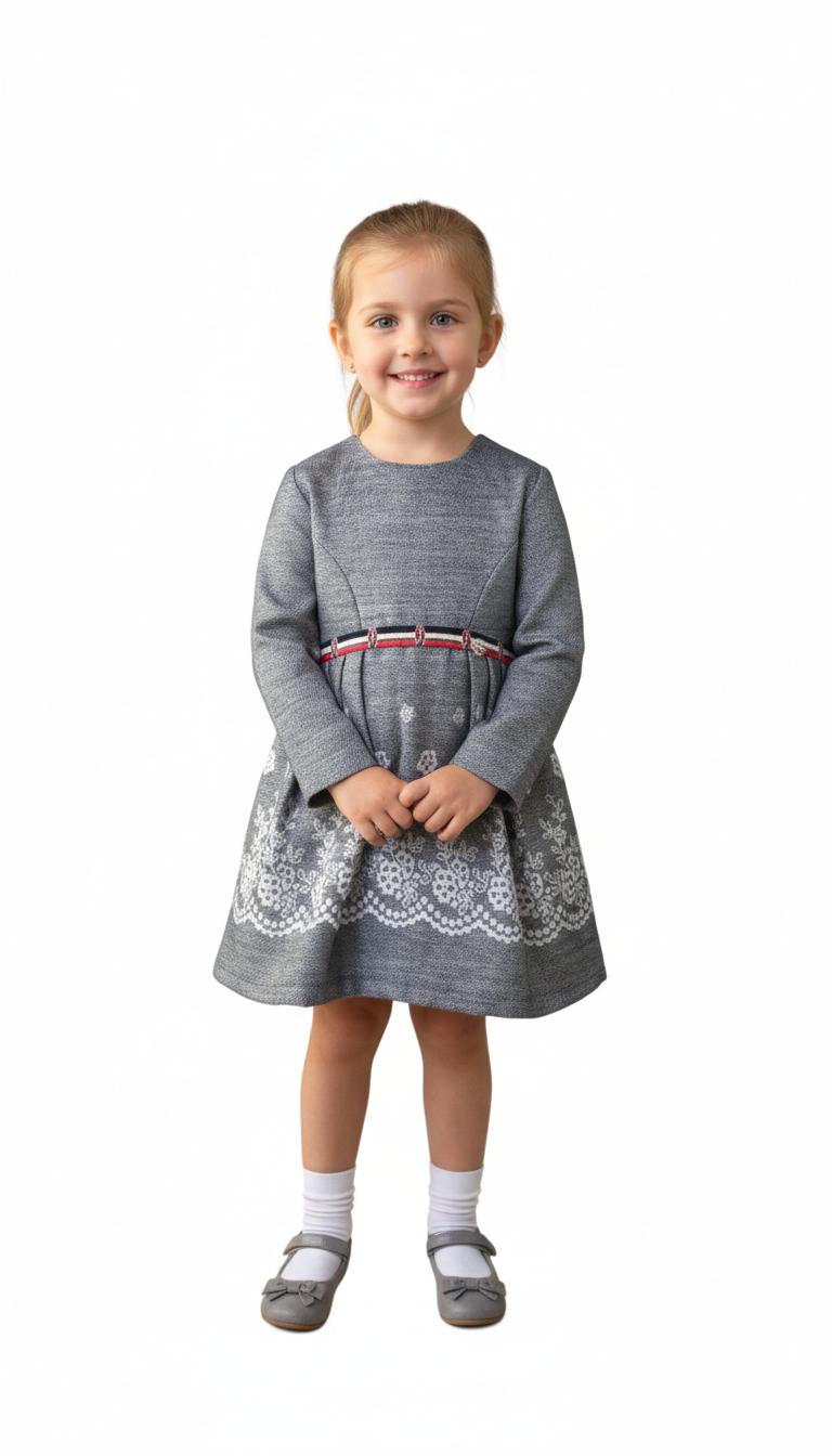 El color gris del tejido jacquard es versátil y fácil de combinar, permitiendo opciones creativas para accesorios y calzado. Este vestido es ideal para eventos especiales, celebraciones o simplemente para que tu niña luzca con elegancia en diversas ocasiones.