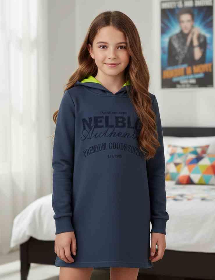 Magnifico vestido de manga larga para niña de la marca Miranda. Vestido tipo sudadera confeccionado en algodón perchado de color azul marino. No lleva ningún tipo de corte y luce capucha forrada dentro en color verde y puños en las mangas. Lleva en el delantero frase relacionadas con la marca.