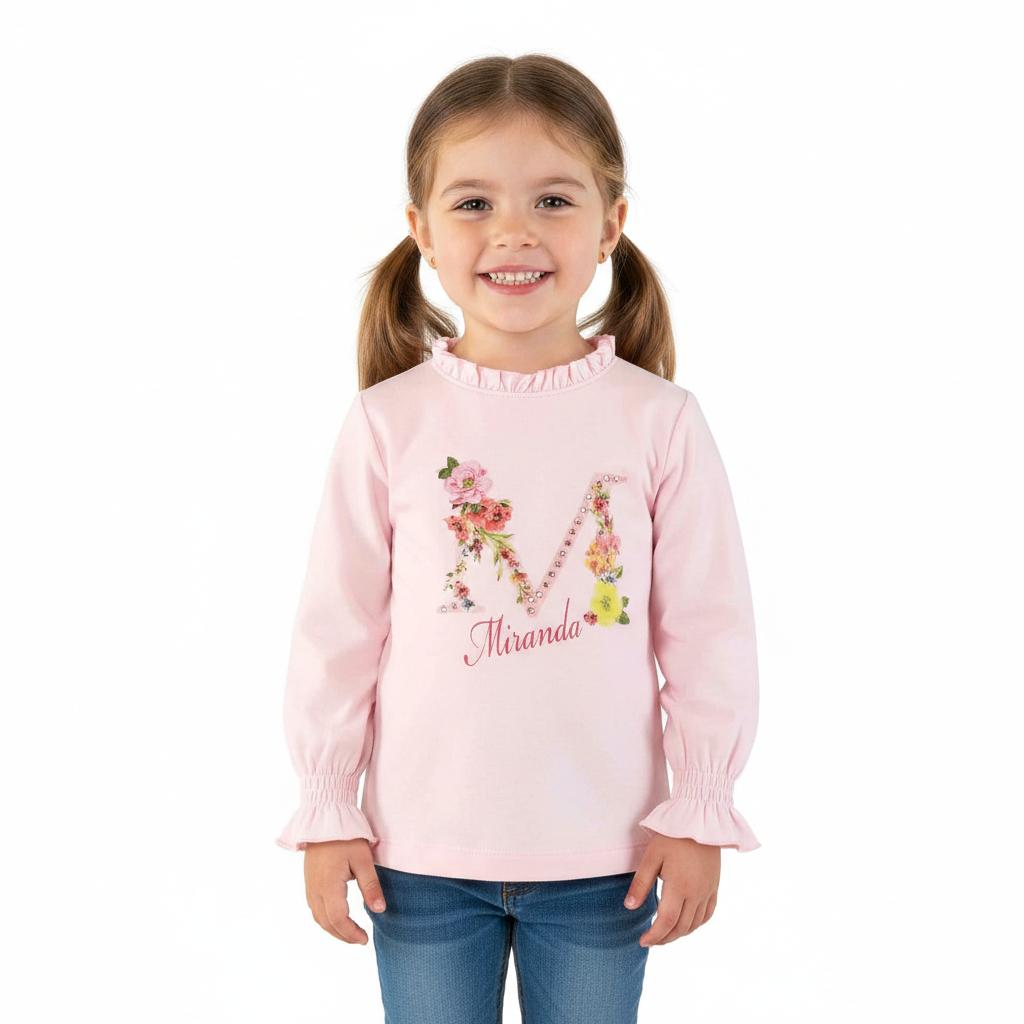 Preciosa camiseta de manga larga para niña de la marca Miranda. Esta confeccionada en algodón de color rosa. Luce volante vertical de la misma tela en el escote y elástico y volante en los puños. Lleva la inicial de la marca en el delantero formada con flores y aplicaciones de strass.