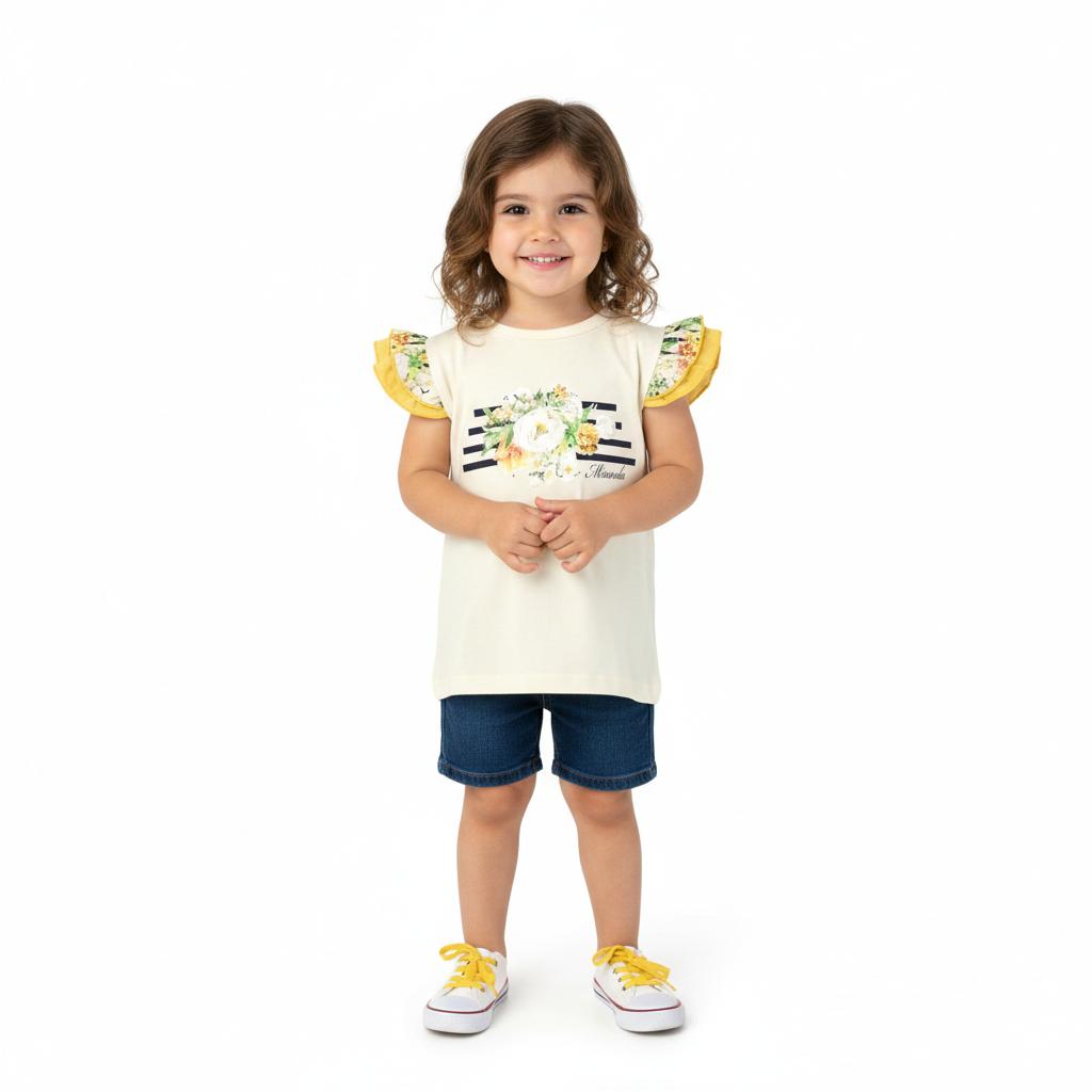 Estilosa camiseta sin mangas para niña de la marca Miranda. Confeccionada en algodón de color crudo. Luce en los huecos de las mangas 2 volantes, uno amarillo de plumeti y otro estampado de rayas y flores. Muestra en el delantero serigrafia del estampado de rayas y flores.