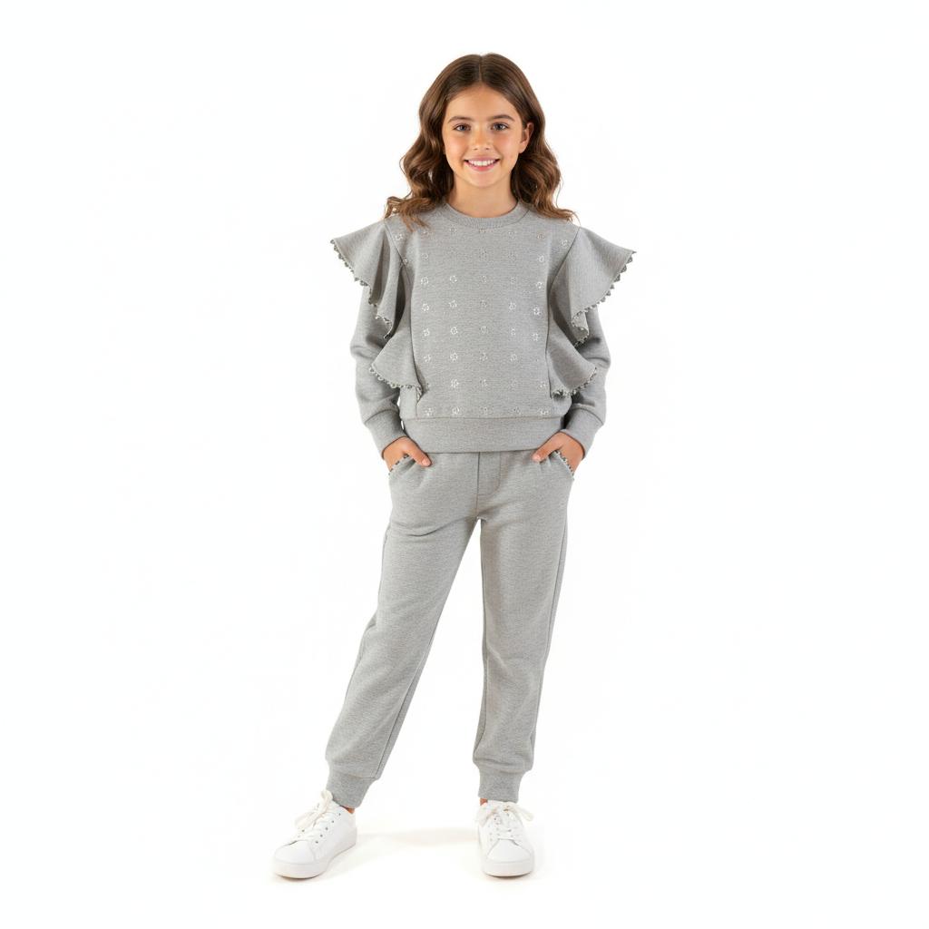 Original conjunto de chándal de 2 piezas para niña de la marca miranda. Sudadera de algodón de color gris con bordados en forma de flor en el delantero. Luce volantes de la misma tela en los hombros. Pantalón gris con bolsillos funcionales y elástico en la cintura.