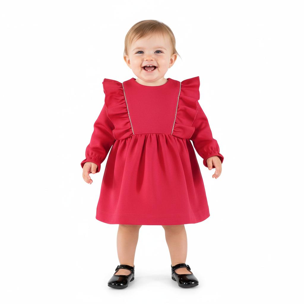 Delicado vestido de manga larga para niña de la marca Miranda. Esta confeccionado integramente en color fucsia. Lleva corte en la cintura con mucho drapeado y se adorna con volantes de la misma tela en los hombros con aplicaciones de strass. Cierra con botonadura vista en la espalda.