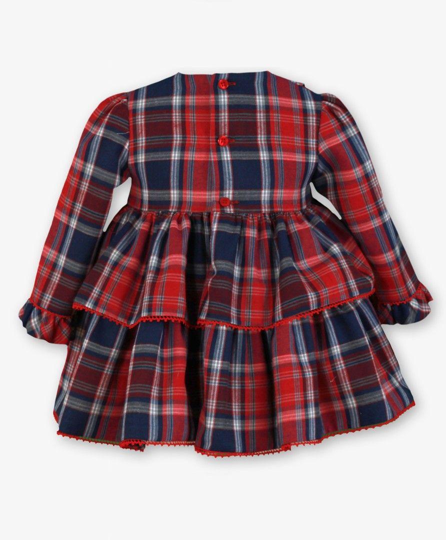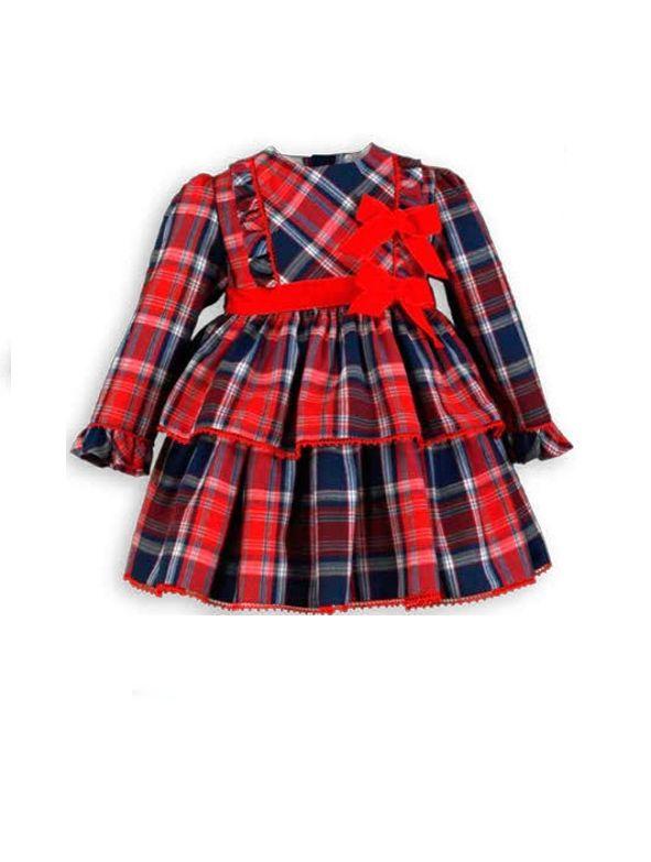 Maravilloso vestido de manga larga para bebe niña de la marca Miranda. Esta confeccionado en tejido estampado de cuadro escoces rojo y azul. Es de corte en la cintura con falda voluminosa de 2 volantes ribeteados con pequeñas borlas rojas. Luce drapeado en el corte, asi como tira de terciopelo rojo en la cintura y 2 grandes lazadas de terciopelo rojo en el delantero. Cierra en la espalda.