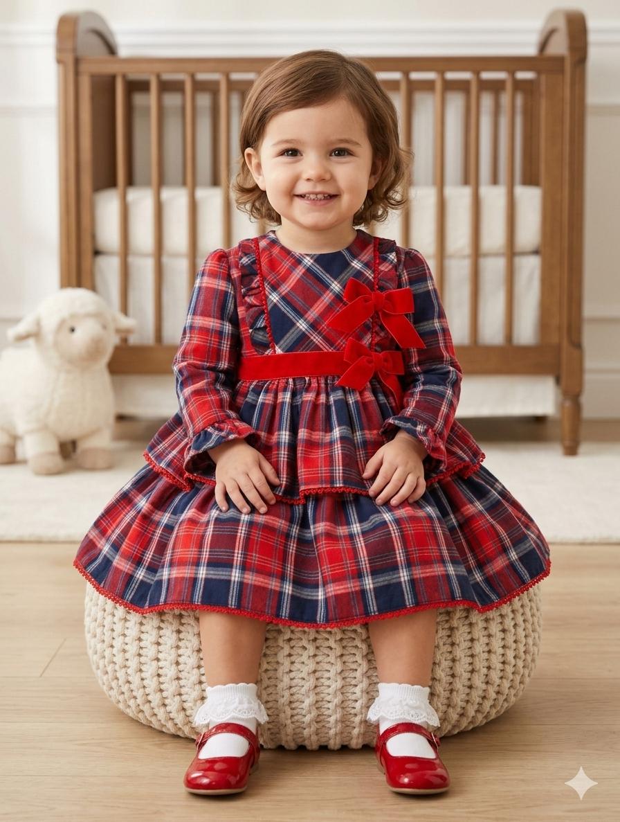Este maravilloso vestido de manga larga para bebe niña de la marca Miranda es una auténtica joya de estilo clásico con un toque festivo, ideal para ocasiones especiales o celebraciones. Confeccionado en un elegante tejido estampado de cuadro escocés en tonos rojo y azul, transmite calidez, tradición y distinción. Su diseño cuidado y lleno de detalles lo convierte en una prenda única y encantadora.
