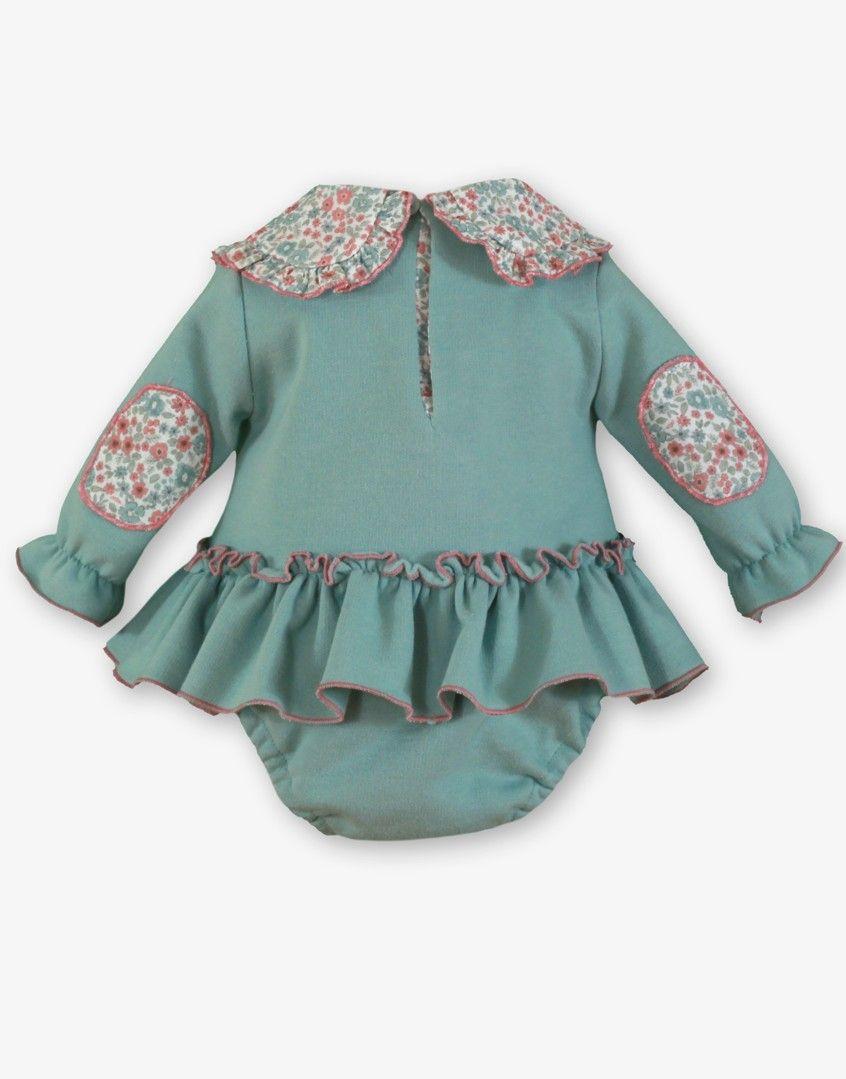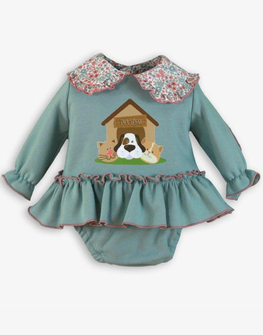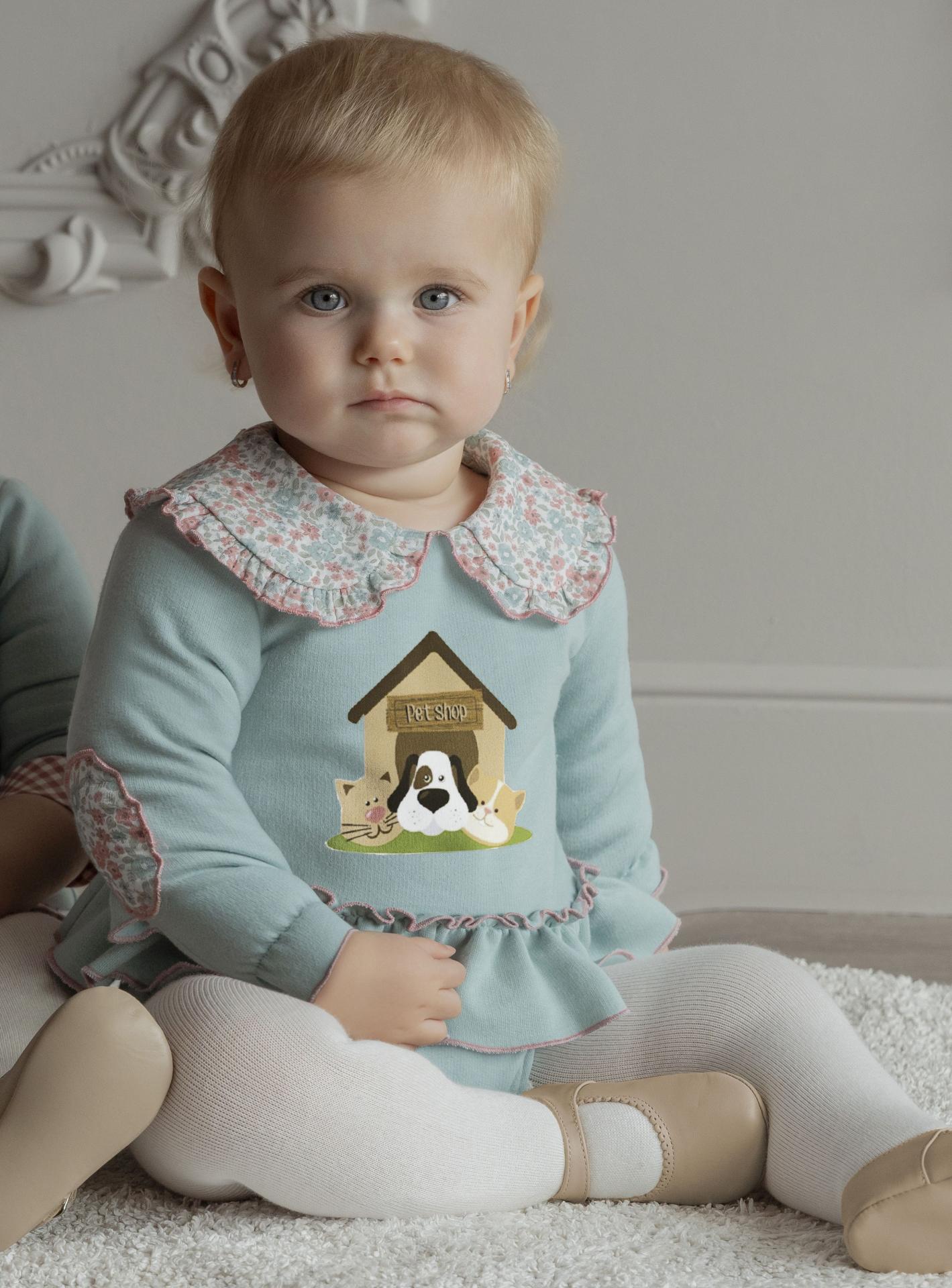 Encantador conjunto de 2 piezas para bebe niña de la marca Miranda. Esta compuesto de sudadera de algodón perchado con volante de la misma tela en el bajo. Luce gran cuello de solapas y coderas con estampado de flores y se adorna con serigrafia de animalitos en el delantero. Braguita verde agua de algodón perchado a juego.