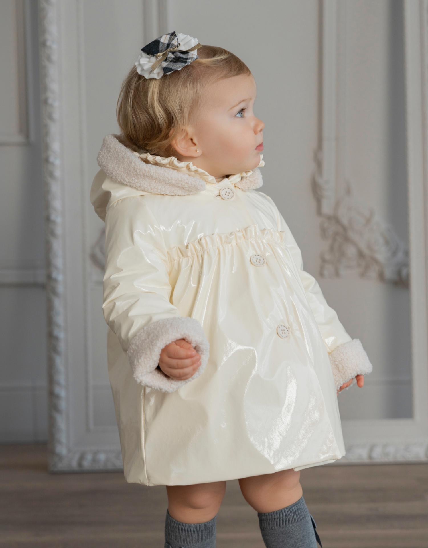 Estupendo abrigo para bebe niña de la marca Miranda. Esta confeccionado en charol beig y es de corte alto. Lleva capucha, y luce pieza de cálido borreguito en los puños y el borde de la capucha. Cierra en el delantero con botonadura vista de 3 botones.