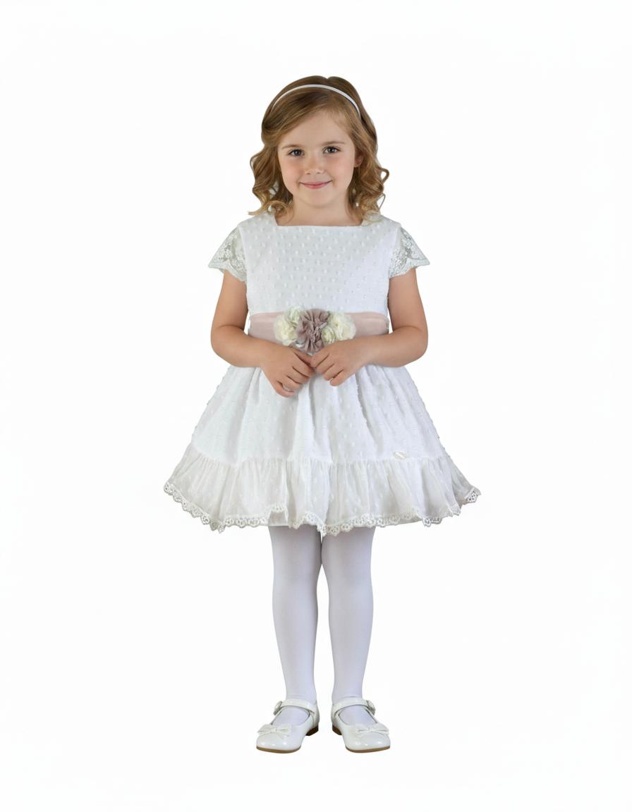 Miranda vestido infantil Ceremonia Plumeti blanco mangas encaje fajin rosa "Cassiopeia" 0221/V