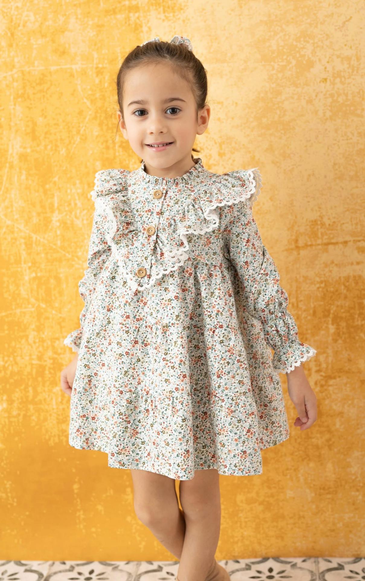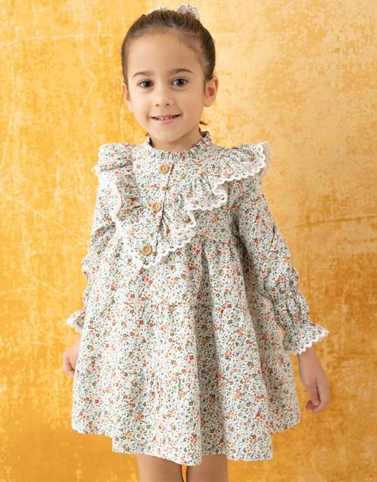 Elegante vestido de manga larga para niña de la marca Basmartí. Esta confeccionado integramente en tejido estampado de florecillas en tono caldera. El vestido es camisero y tiene botonadura de 3 botones en el delantero. Luce cuello redondo a la caja con pequeño volante vertical. Se adorna con volantes de la misma tela rematados con puntilla blanca en los puños y el delantero.