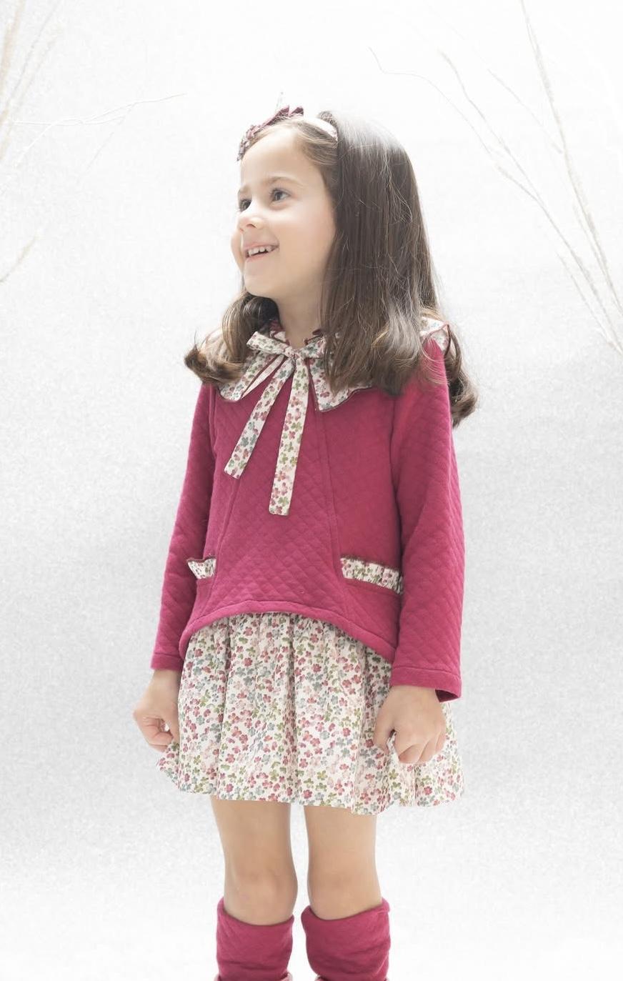 El cuerpo está confeccionado en cálido y estructurado cloqué de color fucsia, que aporta un efecto visual rico y sofisticado. La falda, perfectamente coordinada, está realizada en un delicado tejido estampado con flores en tonos que armonizan con el fucsia del cuerpo, creando un conjunto equilibrado y muy vistoso.