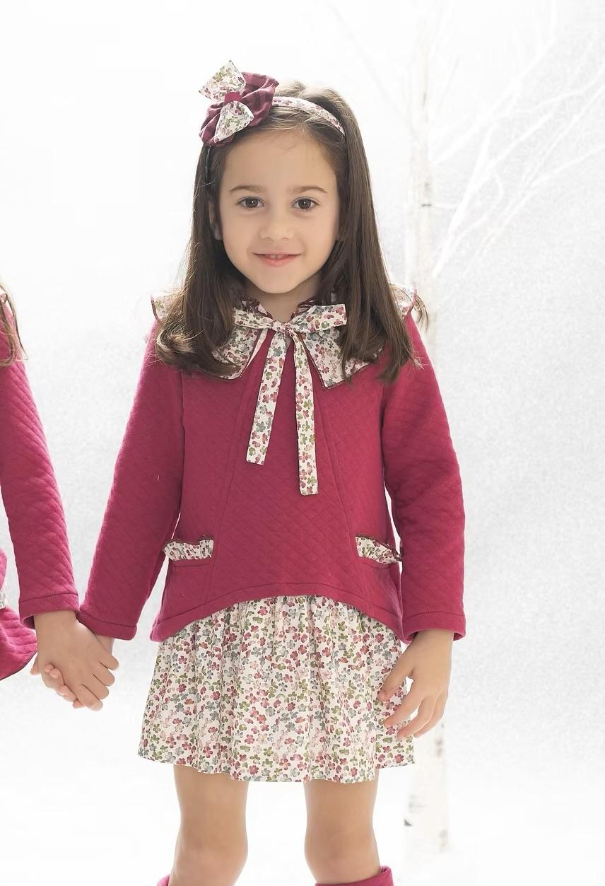 Grandioso vestido de manga larga para niña de la marca Basmartí. Esta confeccionado con el cuerpo de cloque fucsia, armoniosamente combinado con la falda que es estampada de flores combinadas al tono. Luce volante en el cuello y lazada del mismo tejido de la falda y bolsillos simulados. Cierra en la espalda.