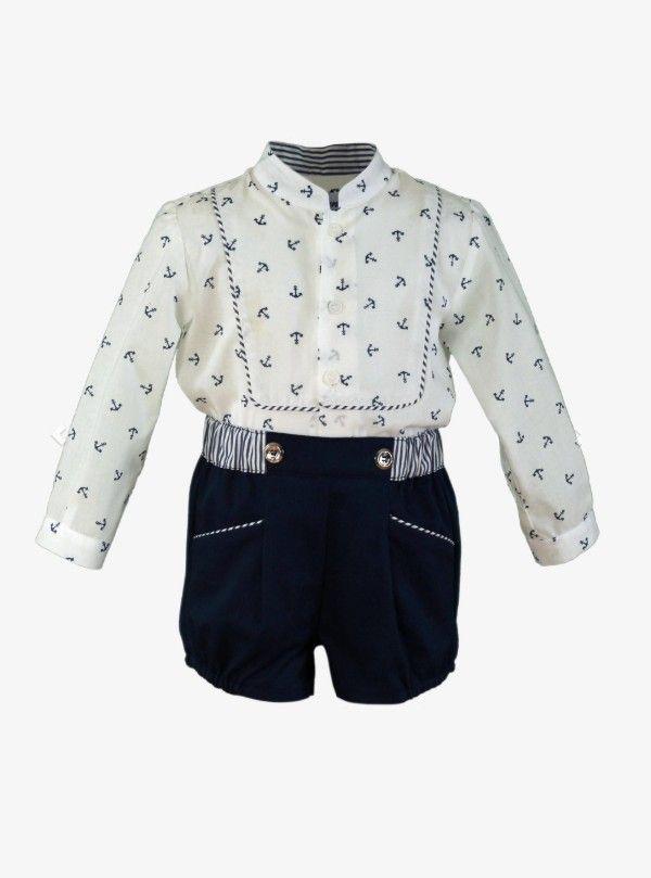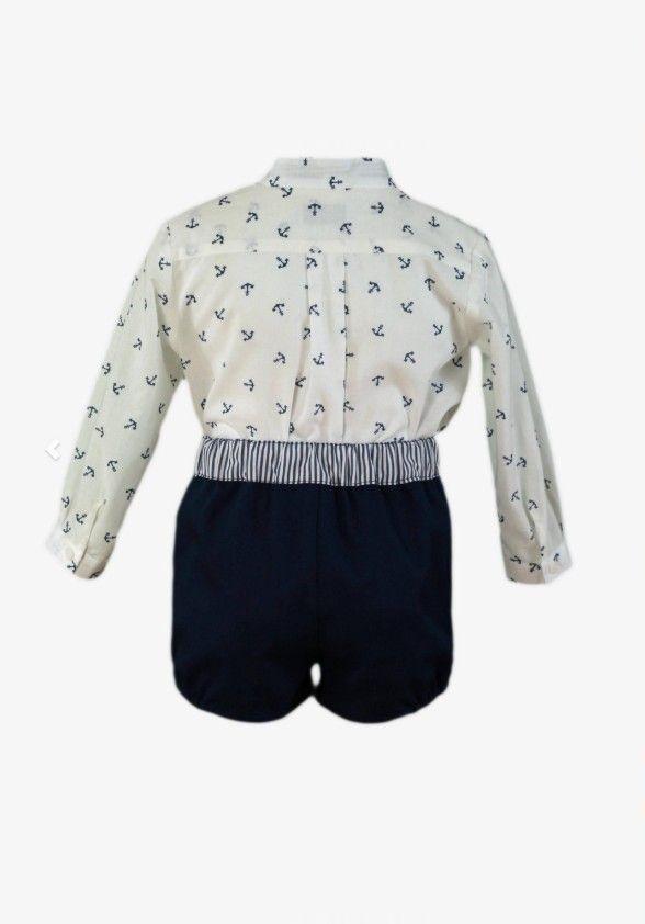 Original conjunto de ceremonia para bebe niño de la marca Miranda. Esta compuesto de camisa de manga larga de color blanco estampada de anclas que luce cuello mao y vivo de rayas en el delantero. Cierra con botonadura vista delantera. Combinada con pantalón corto azul marino, con pieza de rayas y elástico en la cintura y bolsillos funcionales en el delantero.
