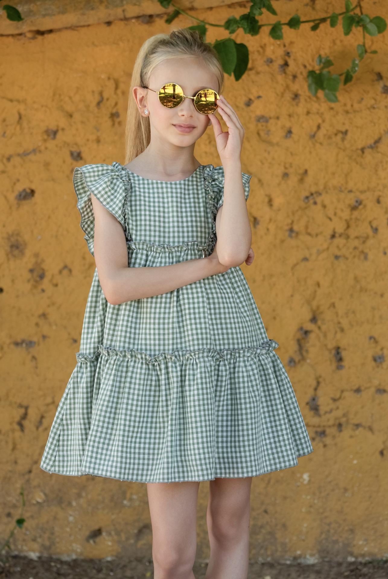 Elegante vestido para niña de la marca Vera, confeccionado en tejido de cuadro vichy en tono verde kaki, ideal para lucir en eventos especiales o para un look refinado en el día a día.