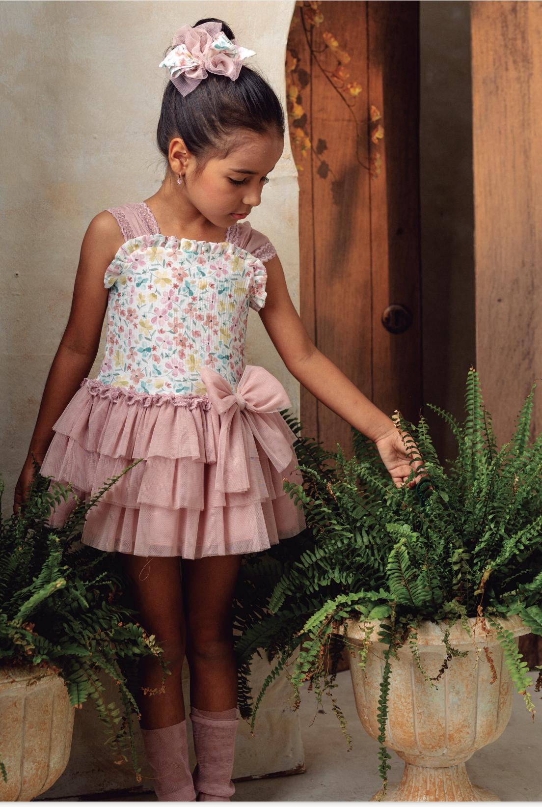 La falda, confeccionada en tul rosa empolvado, está formada por tres volantes superpuestos que le dan gran volumen y movimiento, ideal para niñas que adoran girar y jugar. Como detalle central, el vestido luce una gran lazada de tul rosa situada en el corte de la cintura, realzando el conjunto.