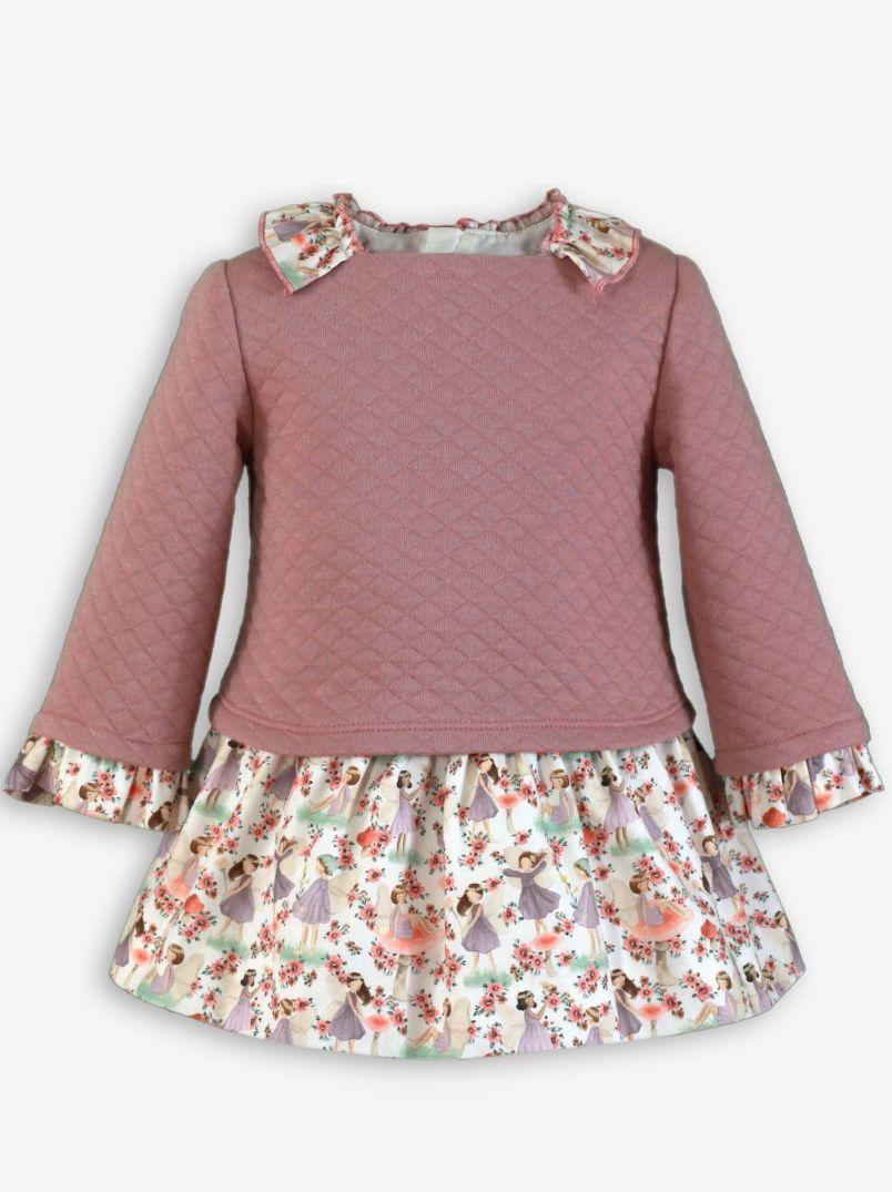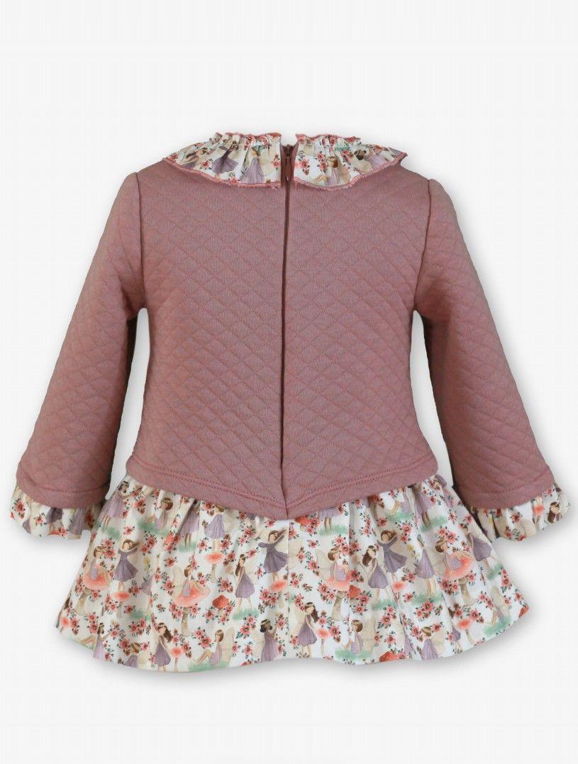Maravilloso vestido de manga larga para niña de la marca Miranda. Simula que el vestido fuesen 2 piezas. La falda es blanca estampada de niñas y flores en tonos rosa y morado y el cuerpo es tipo sudadera confeccionado en cloqué rosa palo con volante de la tela de la falda en el cuello y los puños. Cierra en la espalda.