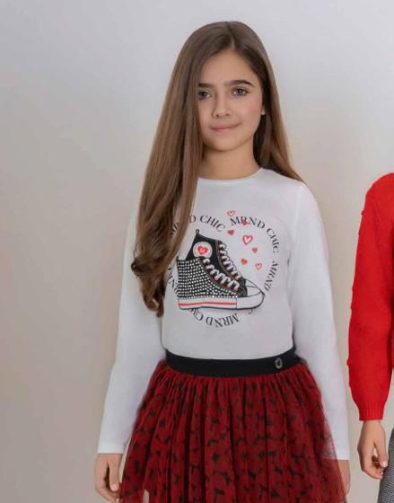 Estilosa camiseta para niña de manga larga de la marca Miranda. Esta confeccionada en color blanco con serigrafia de zapatillas tipo converse en el delantero, en tono negro con corazones y detalles rojos.