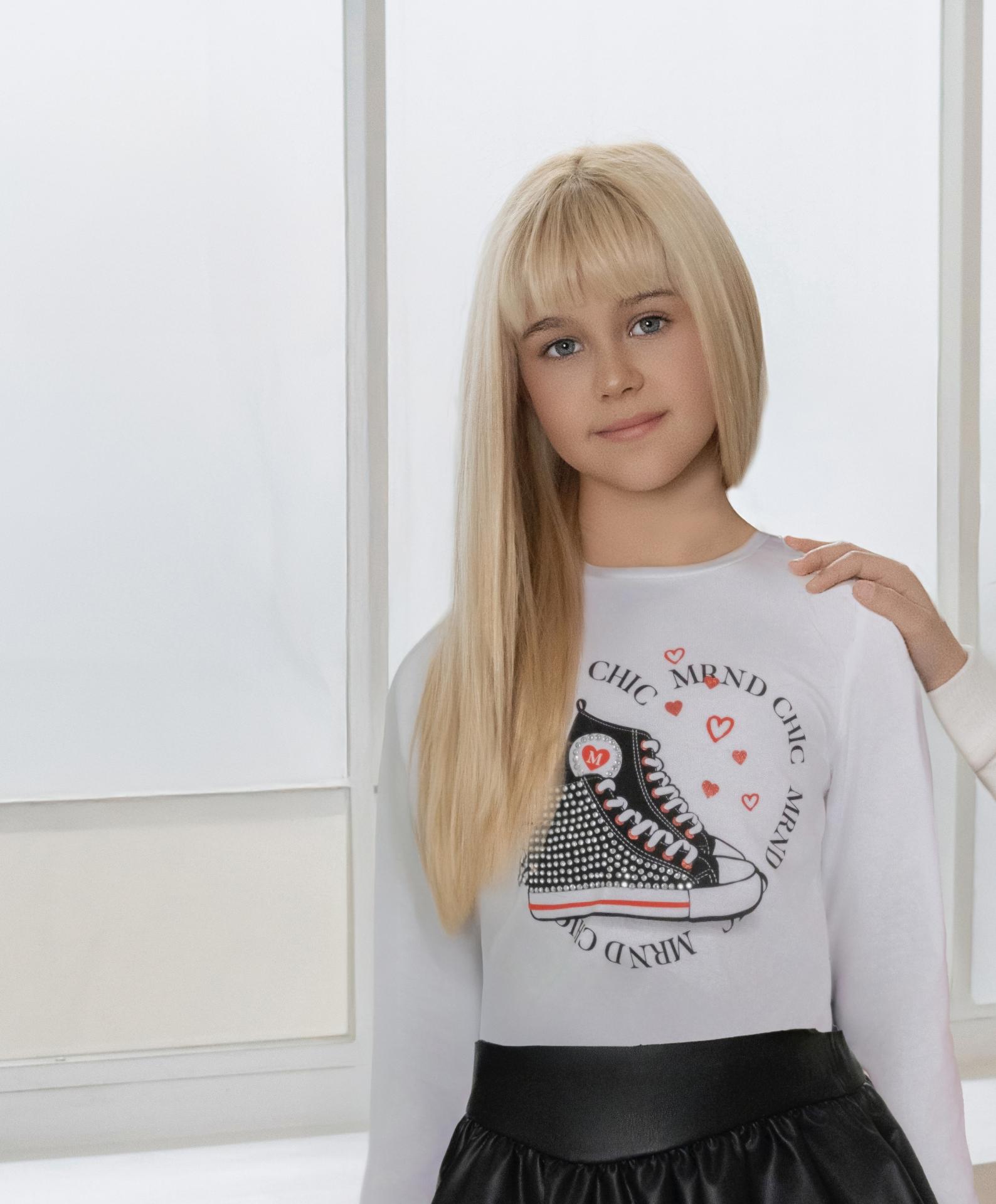 Estilosa camiseta de manga larga para niña de la marca Miranda, confeccionada en suave tejido de color blanco que aporta comodidad y versatilidad. Destaca por su divertida serigrafía en el delantero, que muestra unas zapatillas tipo Converse en tono negro, decoradas con corazones y detalles en rojo, añadiendo un toque juvenil y moderno. De corte clásico y ajuste cómodo, esta camiseta es ideal para combinar con faldas, vaqueros o pantalones casuales, convirtiéndose en una prenda imprescindible para el día a día con mucho estilo.