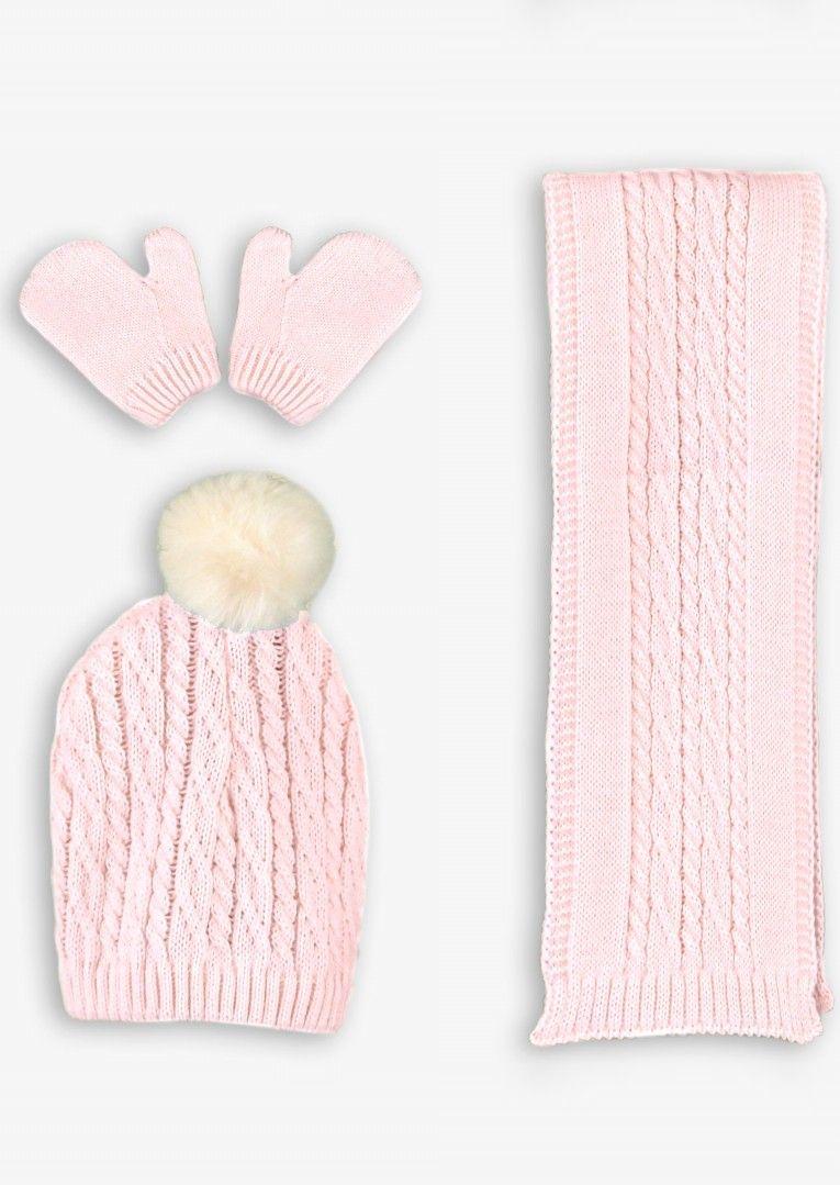 Precioso conjunto para niñas de la marca Miranda compuesto de gorro con pompom beige, bufanda y manoplas en color rosa. Confeccionado en suave punto trenzado.