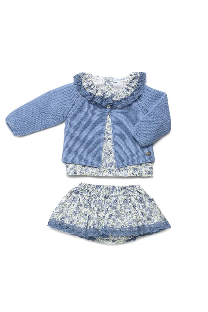 Conjunto de 3 piezas para bebé niña de la marca Juliana. Se compone de chaqueta azul de manga larga tipo ranglán con botonadura delantera, blusa blanca estampada de flores en tono azul, de manga larga con volante en el cuello ribeteado con puntilla azul y braguita con sobrefalda del mismo estampado, con elástico en la cintura y las perneras que lucepuntilla azul en el bajo.