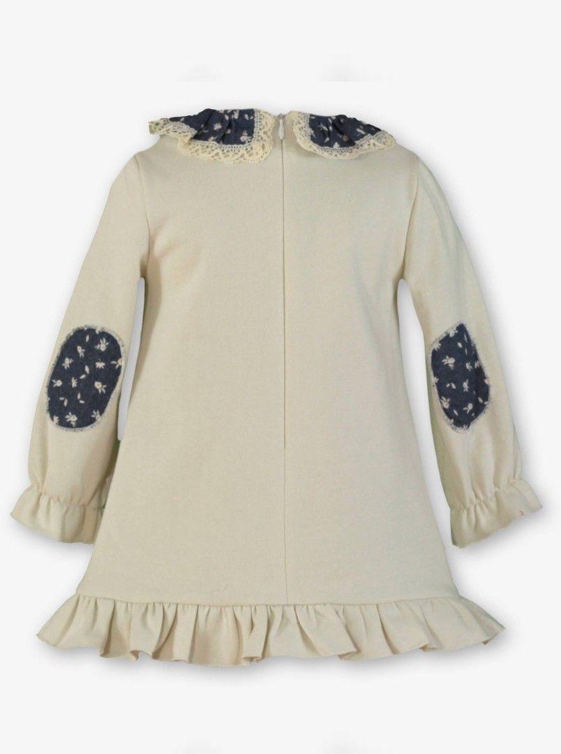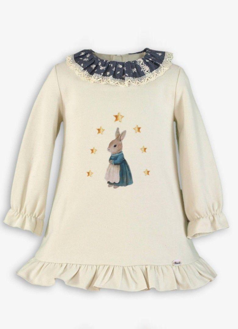 Magnifico vestido de manga larga para niña de la marca Miranda. Es de corte evasé de tipo sudadera y esta confeccionado en algodon perchado color nata. Se adorna en el cuello con volante estampado azul marino con puntilla y luce serigrafia de conejita y estrellas en el delantero. Lleva pequeño volante de la misma tela en el bajo y cierra en la espalda.