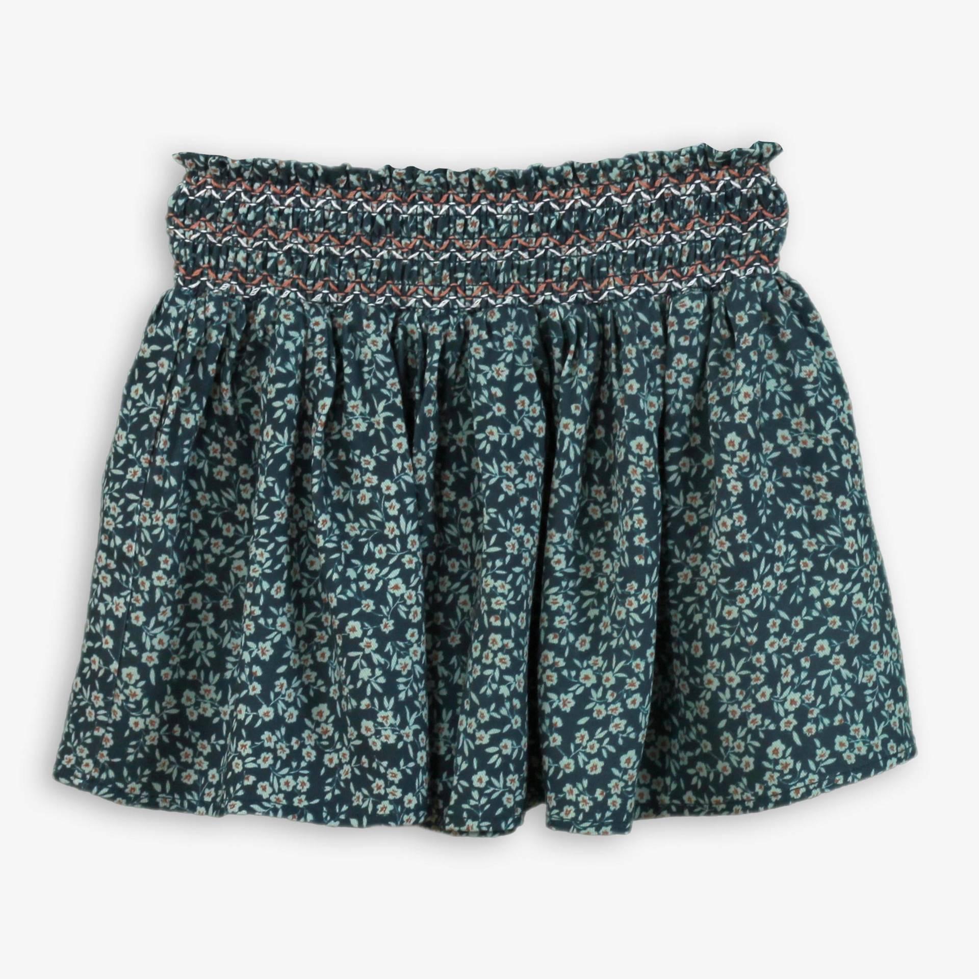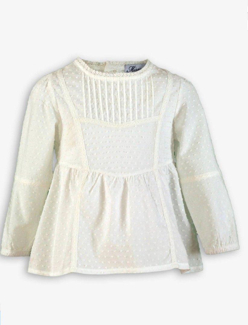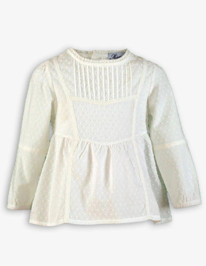 Magnifico conjunto de 2 piezas para niña de la marca Miranda. Compuesto por blusa de popelina de manga larga en color crudo que cierra en la espalda y faldita estampada de flores en tono marino y verde con elástico en la cintura.